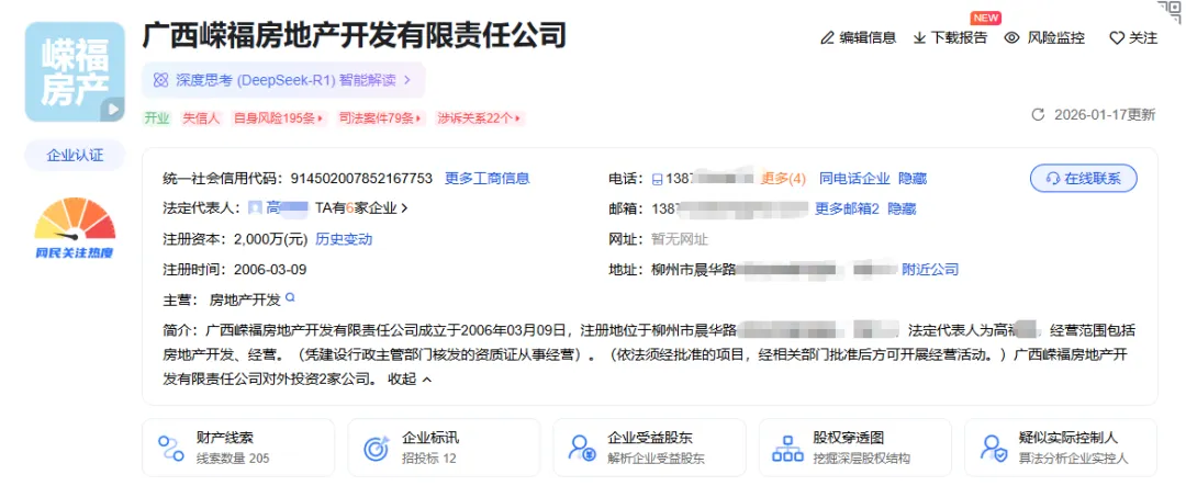 据法拍信息,去年的两次法拍上,广西嵘福房地产开发有限责任公司都是嵘福大厦13-16层的标的物权利人,目前这家房开还是开业状态,两名股东依旧被限制高消费。
