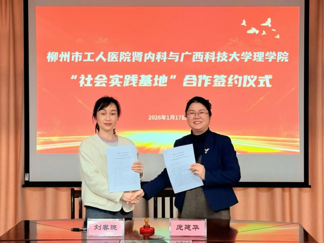 1月17日,理学院与柳州市工人医院肾内科举行社会实践基地协议的签约仪式。仪式在柳州市工人医院肾内科会议室举行,理学院院长庞建华,教师代表张成磊、陈胜、陈玟宇出席仪式。柳州市工人医院肾内科主任刘春晓、二病区主任谭鹤长、二病区副主任黄雯静和各病区护士长共同参加。