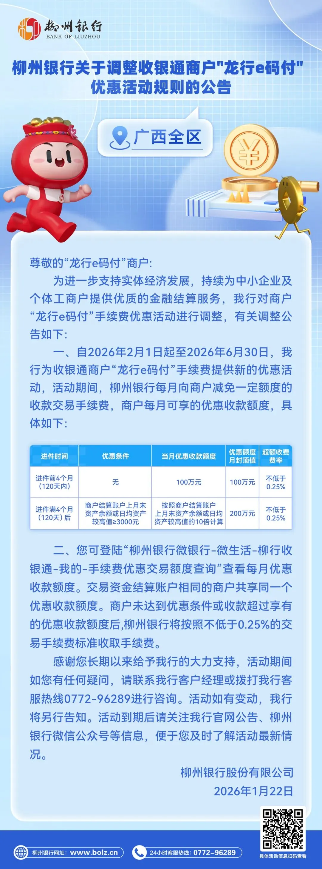 >公告 | 柳州银行关于调整收银通商户“龙行e码付”优惠活动规则的公告