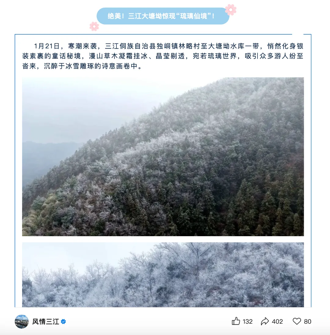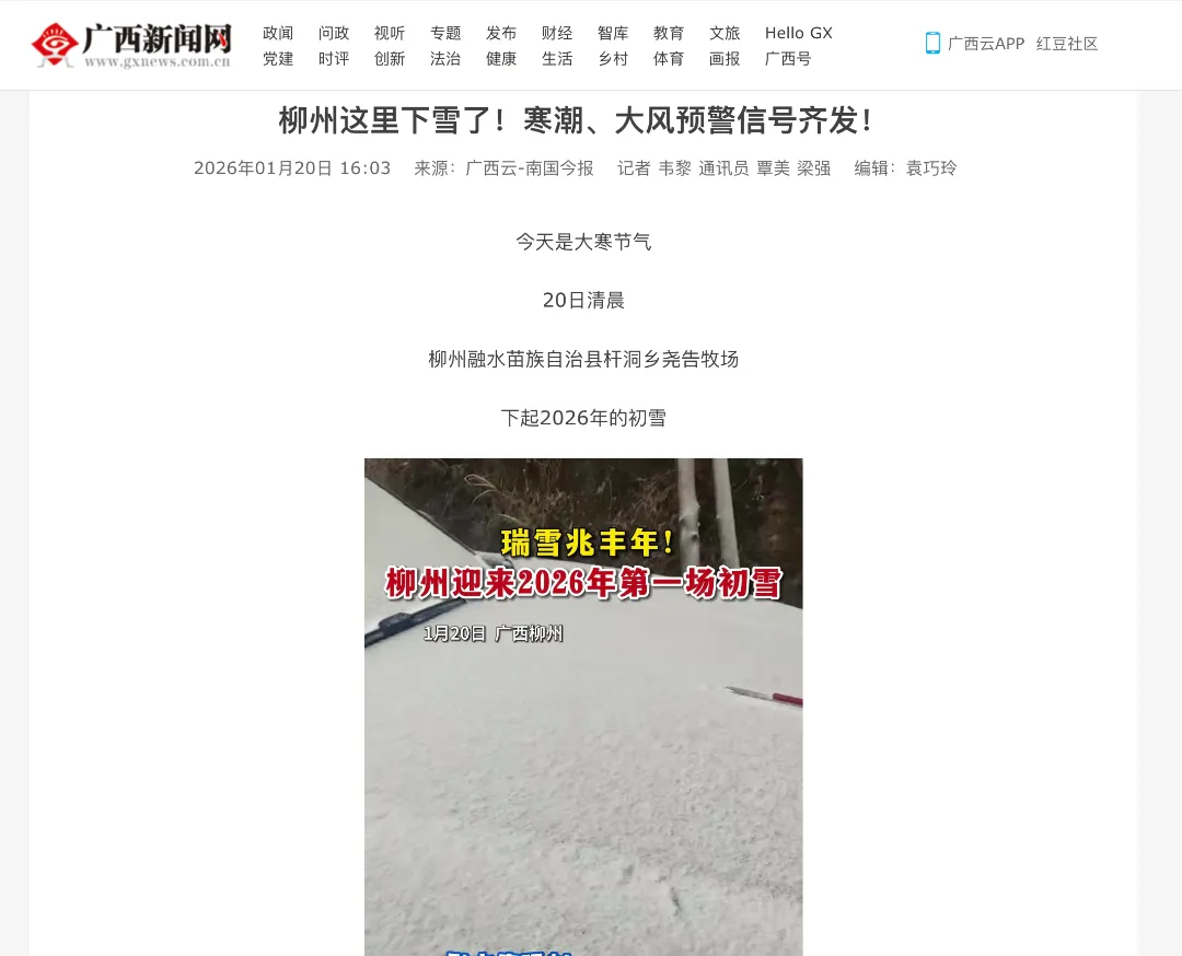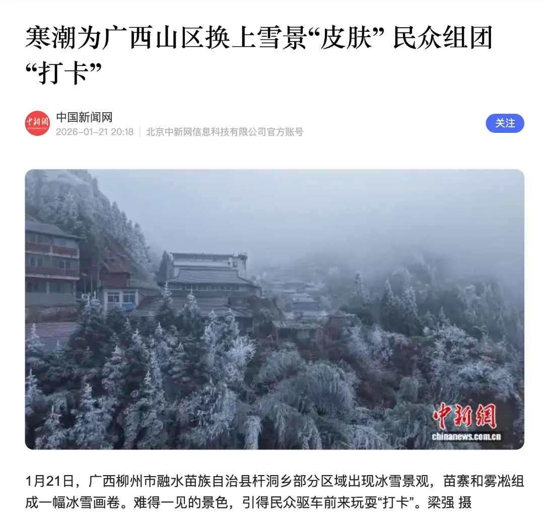 近日,柳州迎来持续低温寒潮天气,面对“速冻”模式,柳州一手抓安全,一手抓发展,在强化应对措施的同时,抢抓冬游经济发展机遇,利用南方地区难得的冬雪画卷拉动一波“打卡热”,吸引了中央、自治区多家主流媒体关注。