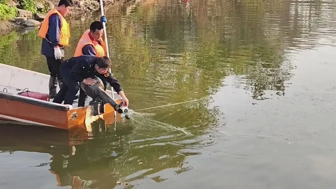 执法与保洁人员抵达现场岸边后,确认涉事水域存在非法布设的渔网,非法捕捞人员已提前逃离。随后,搭载工作人员的冲锋舟驶入目标水域开展全面排查,作业期间突发水下渔网缠绕螺旋桨的险情,导致舟艇暂时无法正常行驶。工作人员迅速协同配合,借助专业工具拆解缠绕渔网,并以该点位为核心,对周边水域开展细致排查与集中清理。