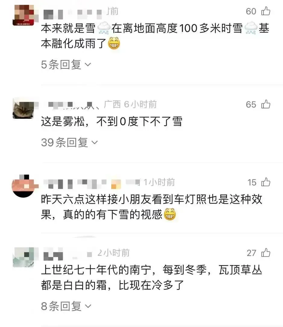 那么,南宁市区真的下雪了吗?1月22日上午,广西气象台首席预报员农孟松表示,21日以来南宁最低气温3℃~5℃,并伴随降水,南宁市气象台的探空气球监测到在南宁上空确实有一层比较厚的云,但云的温度在0℃以上,所以并没达到降雪的条件。网友拍到的视频,有可能是毛毛雨在灯光照射下的视觉效果。