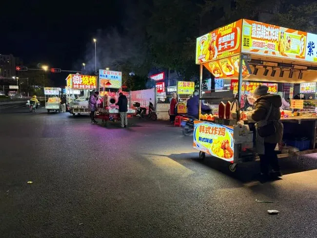 在苏卢二路与安吉大道交叉的路口,“苏卢村”牌坊下两侧就有多个夜宵摊,延伸到了安吉大道的主干道上,也就是机动车道。