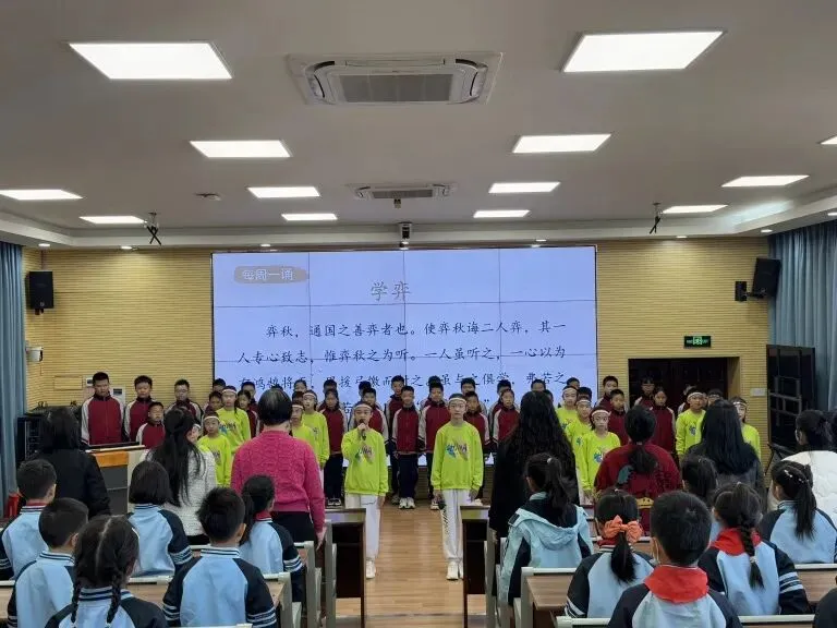 经典浸润心灵,自律点亮成长。在每周一诵环节,全体师生起立端身正意,在主持人的带领下共读《孟子·学弈》:弈秋,通国之善弈者也。使弈秋诲二人弈,其一人专心致志,惟弈秋之为听。一人虽听之,一心以为有鸿鹄将至,思援弓缴而射之。虽与之俱学,弗若之矣。为是其智弗若与?曰:“非然也。”