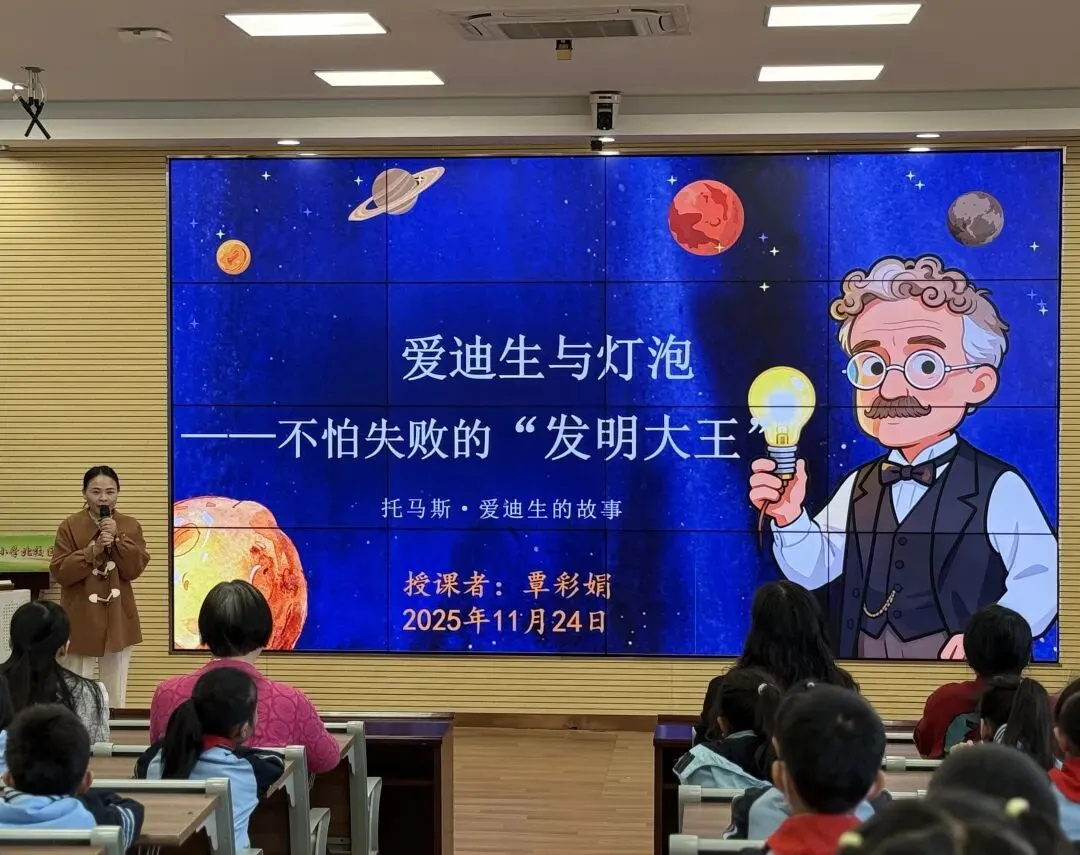 知行汇泓,品慧致爱。在泓爱大讲堂中,覃彩娟老师为二年级同学带来了主题为“爱迪生与灯泡——不怕失败的‘发明大王’”的思政课。课堂伊始,覃老师以趣味谜语瞬间点燃学生好奇心。结合实物模型展示,她引导学生联想“无电之夜”的场景,通过两段短视频直观呈现百年前蜡烛油灯照明的局限与爱迪生发明电灯的艰辛历程,让孩子们真切感受发明背后的执着。