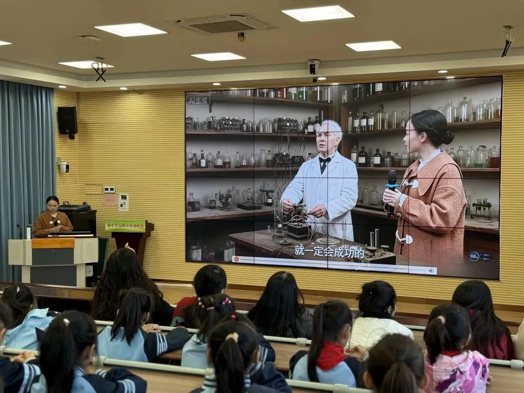 当讲到爱迪生历经上千次失败仍不放弃时,课堂迎来精彩转折。覃老师创新引入AI技术,播放提前制作的30秒“穿越对话”视频,虚拟场景中她与“爱迪生”的互动问答,将抽象精神具象化,让学生近距离感受发明家面对嘲笑时的坚定。“铁丝、铜丝甚至朋友的胡子都成了实验材料,上千次失败都没挡住他”,随着故事推进,孩子们眼神中满是敬佩。