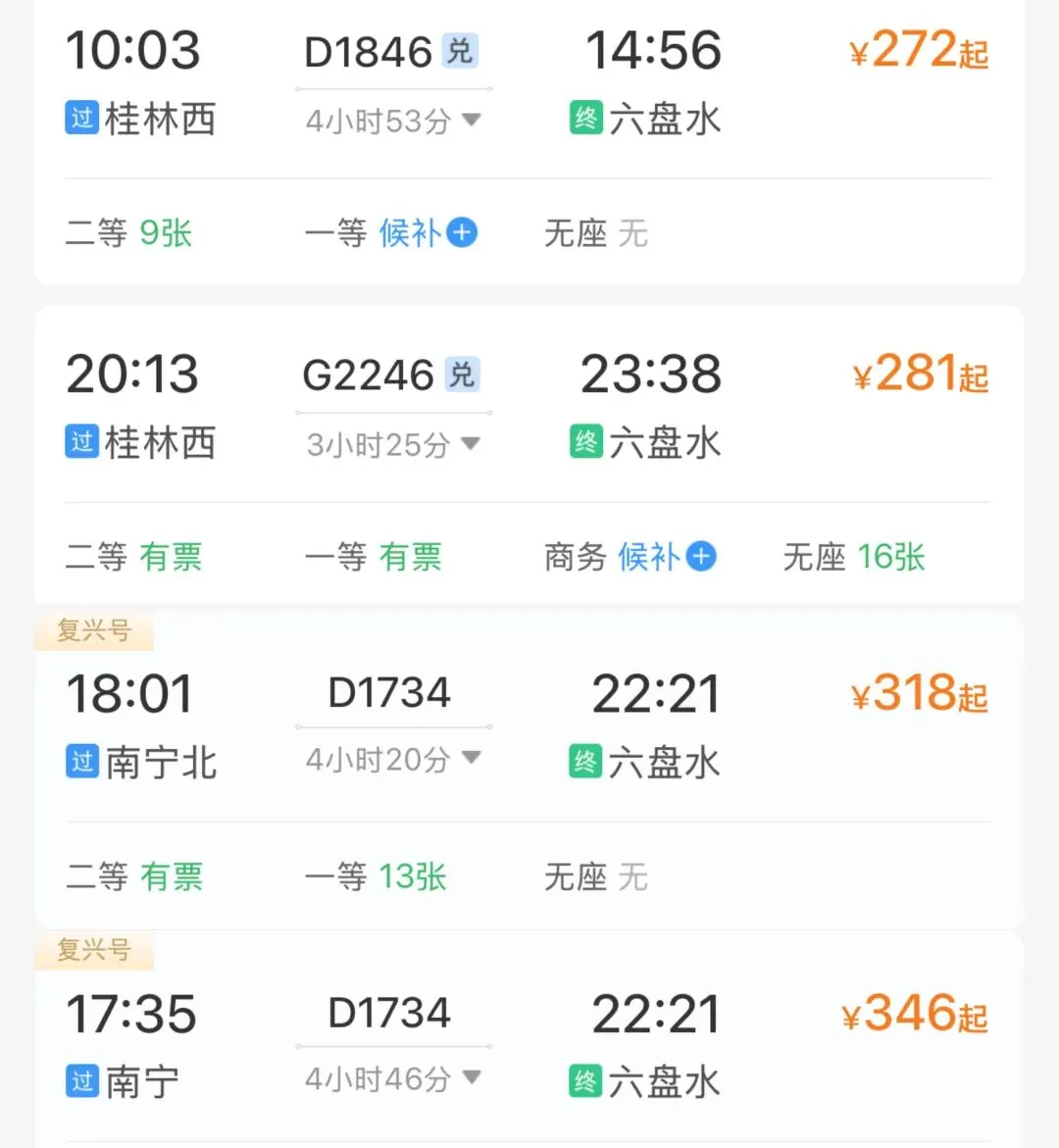 从南宁出发,有两趟列车直达六盘水