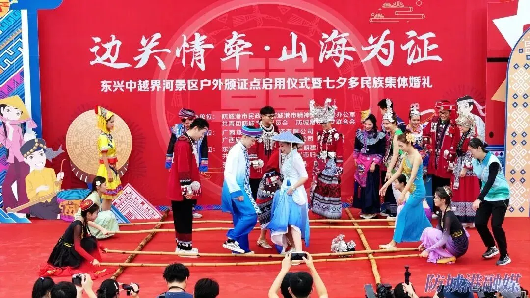 Δ举办防城港市多民族集体婚礼活动,倡导文明婚俗新风尚,展现防城港市独特的边关风情特色。