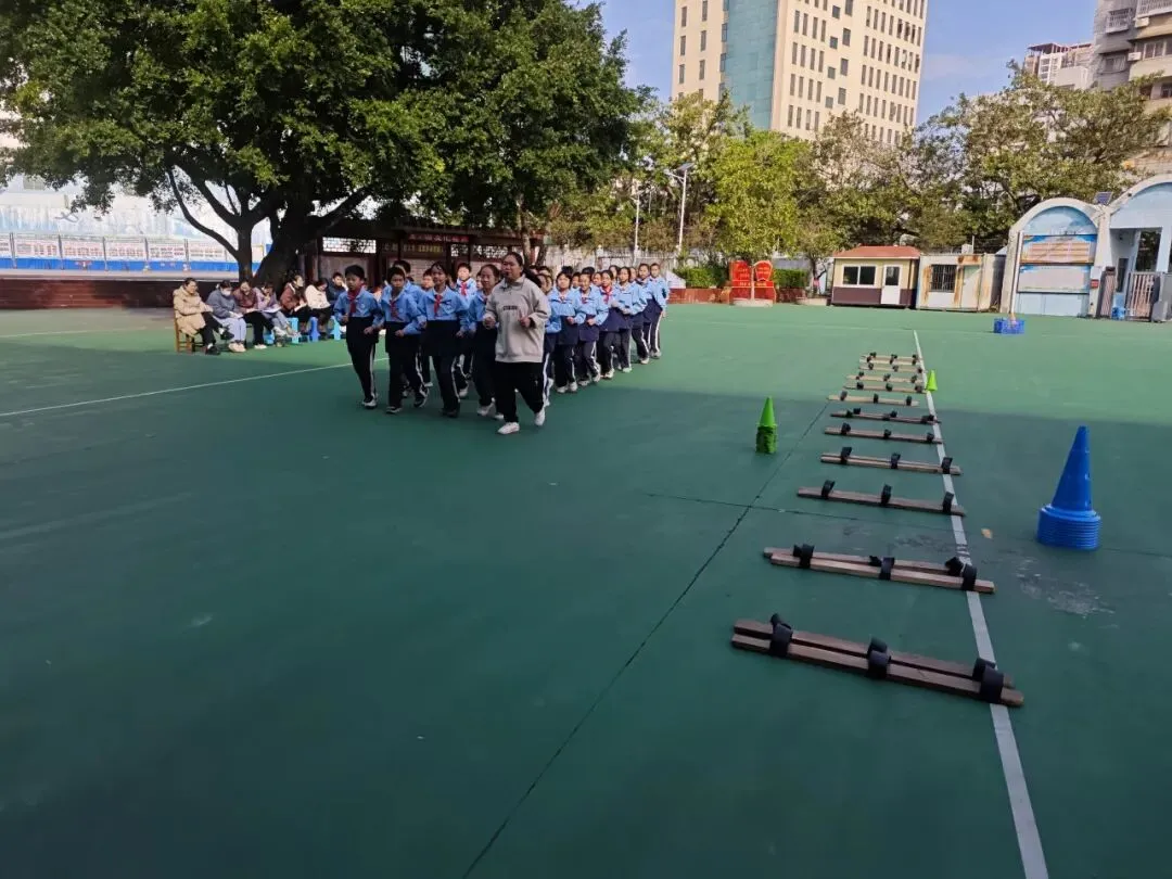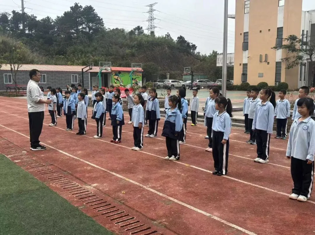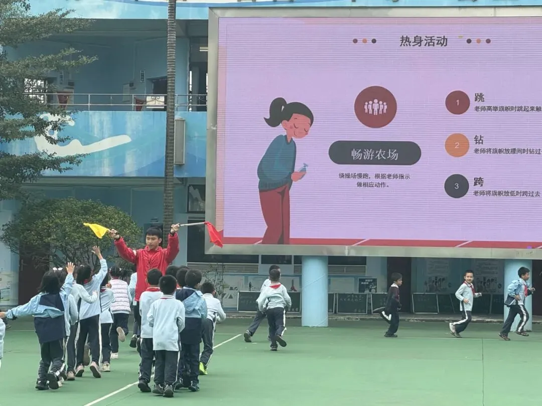 图为:何深冬老师执教一年级体育课《体操课——队列队形训练》