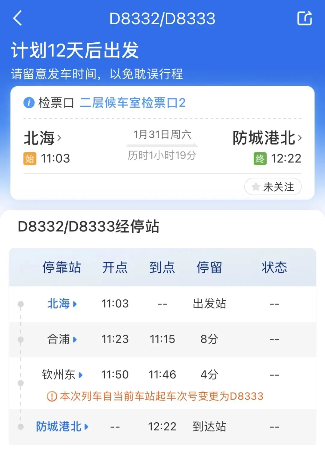 1、D8332/D8333次(北海→防城港北):11:03从北海站始发,经停合浦站(停留8分钟)、钦州东站(停留4分钟,车次变更为D8333),12:22终到防城港北站,全程1小时19分钟。