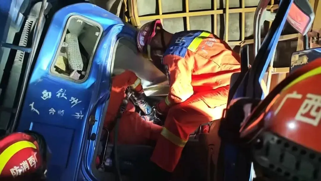 上思县消防救援大队团结路消防救援站赶赴现场发现,事故现场为一辆仓栅式货车追尾封闭式货车,仓栅式货车副驾驶室严重凹陷,乘客胸部被方向盘卡住,情况危急。消防救援人员一边安抚被困乘客情绪,一边使用液压顶杆对变形的驾驶室进行撑顶,扩大救援空间。经过20分钟的精准破拆,被困乘客被安全救出,并交由医护人员进一步救治。