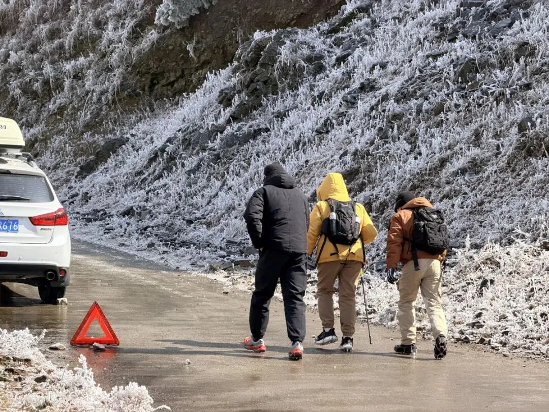 当天下午1时许,记者在融水元宝山林王坳看到此处道路已结冰,交警已经在该岔路口放置了警示牌,同时拉上了警戒线禁止车辆上山。融水交警大队副大队长蒙世乐告诉记者,这两日因为急剧降温元宝山上出现了下雪结冰的情况,不少游客慕名驾车前来观赏雪景或徒步上山,针对上山车辆民警会现场劝返,告知车辆要停靠在安全区域,同时提醒游客赏景要注意安全。