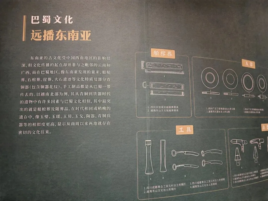 巴蜀和东南亚之间商周时期就已经互通往来,古蜀国神秘瑰丽的青铜文明对东南亚青铜文明产生了深远的影响。广西合浦是汉代海上丝绸之路的起点,合浦汉墓出土的文物中,有来自罗马的钠钙玻璃(杯),有产自印度的绿柱石项链……这是中外文化交流的有力见证。