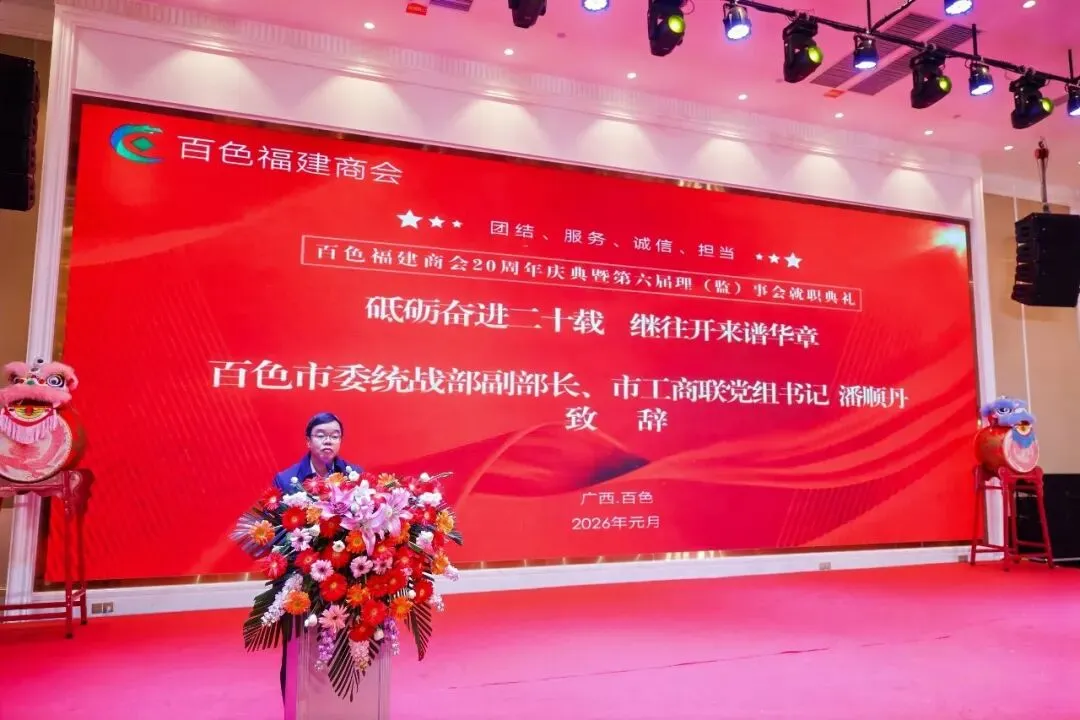 在庆典现场,百色福建商会新任会长林志鹏发表致辞。他表示,商会将始终以“团结、服务、诚信、担当”为精神指引,立足百色、心系闽商,不断夯实交流合作平台,推动闽桂两地经贸往来、文化交流与公益事业协同发展。在回顾商会二十年辉煌历程、展望未来发展蓝图时,林志鹏会长系统总结了商会服务会员、促进发展的阶段性成果,并对新一届理(监)事会工作方向作出部署。他的发言展现了商会凝心聚力、继往开来的坚定决心,赢得了在场嘉宾的热烈反响,也让各界对百色福建商会的未来充满信心与期待。