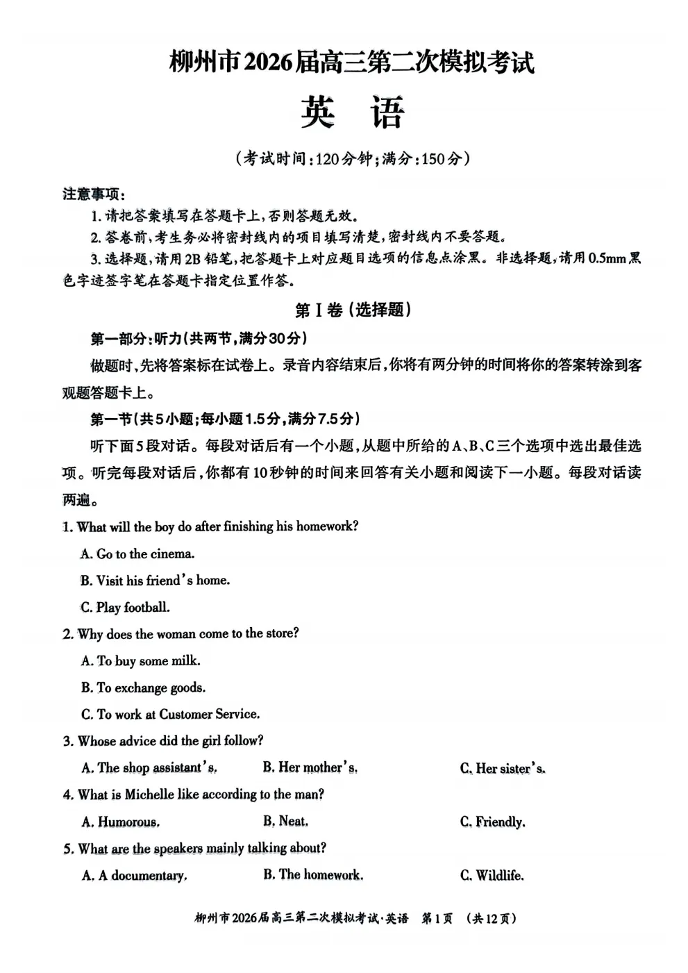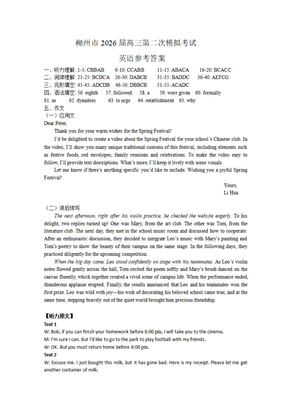 广西柳州市2026届高三第二次模拟考试英语试题及答案