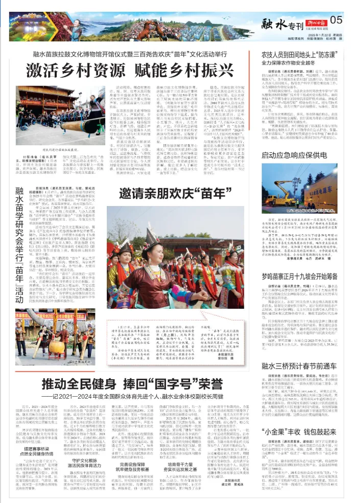 1月17日,良寨乡归坪村平茶屯把苗族新年搬出大山,在县城举办“平茶驻融‘苗年’庆典”活动,吸引周边千余名苗族同胞和游客参与。活动由平茶屯村民自发筹办。活动在芦笙队奏响的《丰收调》中拉开帷幕,苗族姑娘们头戴银饰、脚挂铃铛,在乐曲中跳起传统踩堂舞(见上图),现场舞姿翩翩,银饰叮当,气氛热烈。互动环节十分热闹,大家排队参与拔河、套圈、蒙眼敲鼓、男女搭配接力运气球等有奖游戏,获胜者手捧腊肉、糯米酒等奖品笑得合不拢嘴。“‘苗年’是我们最隆重的节日,以前只在寨子里过,今年大家商量,把亲朋好友都请到县城,大家一起热热闹闹过节!”村民潘鲜琼捧着奖品喜滋滋地说。(通讯员:荣珍珏 )1月19日,融水苗族自治县梦呜苗寨景区举行2026年正月十九坡会筹备工作会议暨坡会纪念碑揭幕仪式,推动民族文化传承与产业发展协同并进。