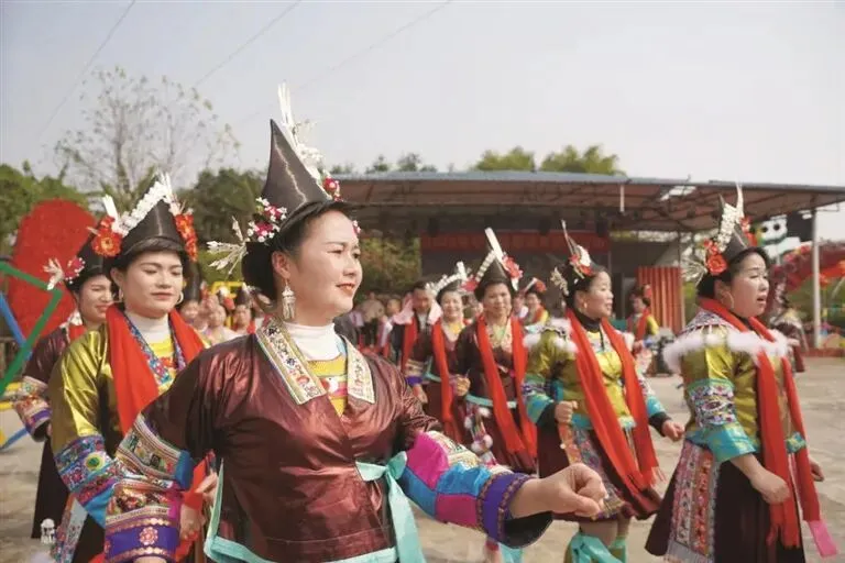 活动现场,周边村寨的苗、瑶、侗、壮等民族同胞身着节日盛装齐聚尧告村,尧告村芦笙队在大寨屯奏响芦笙,以苗族最高礼仪迎接宾客。