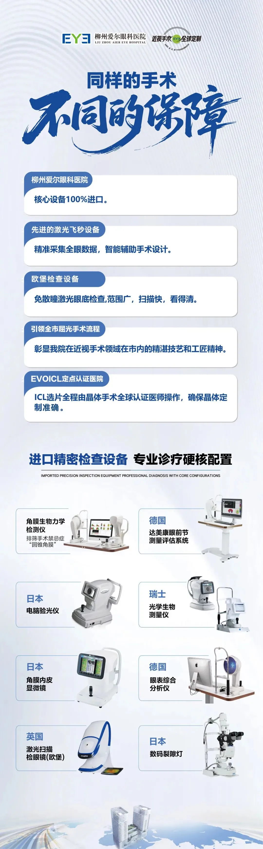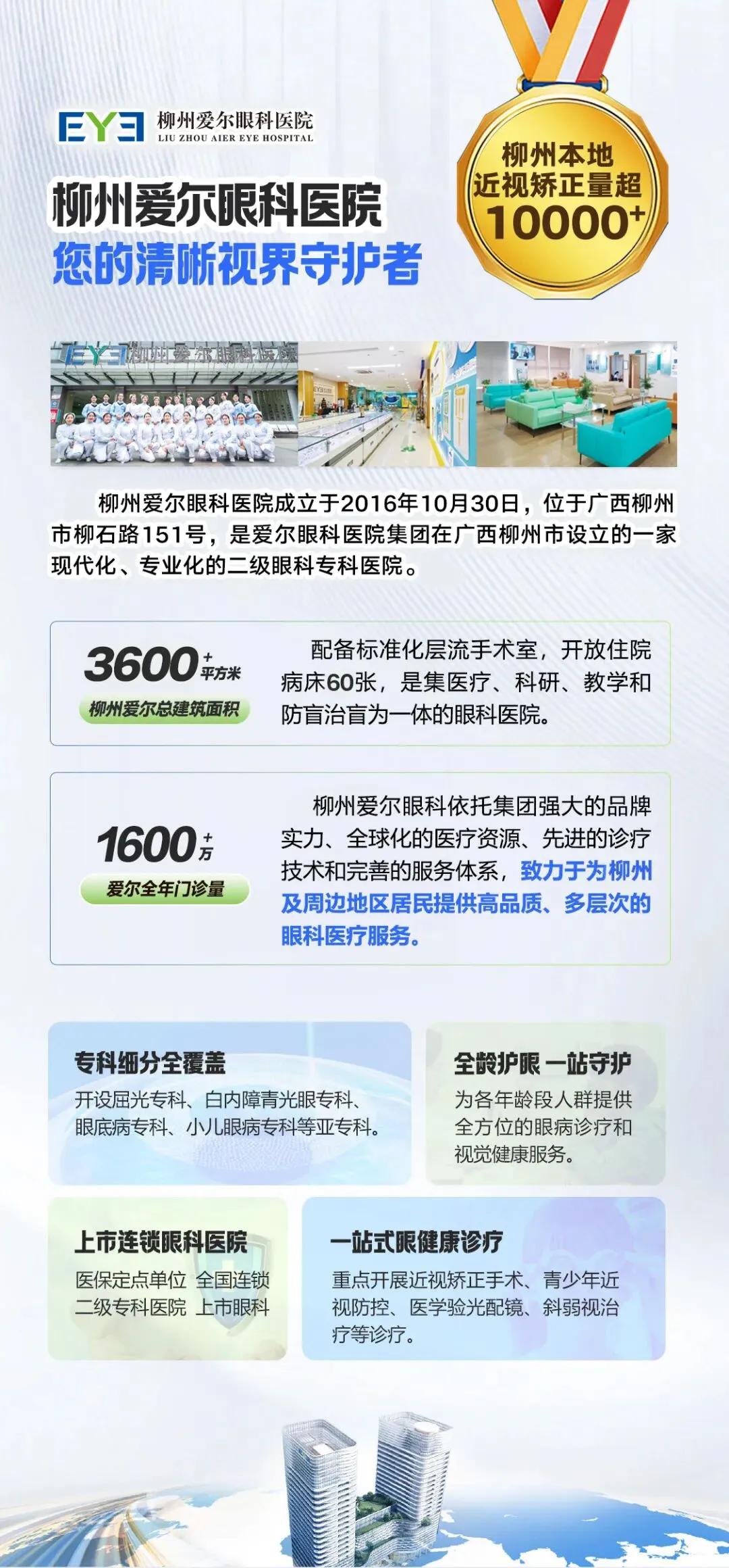 柳州爱尔眼科是爱尔眼科集团旗下的医保定点医院!3600㎡空间+德国蔡司先进设备。陈光胜院长领街9万+手术经验团队,开展ICL晶体植入术、全飞秒、半飞秒、精雕飞秒等全术式覆盖,复查超省心~ 本地看眼科,选它放心!