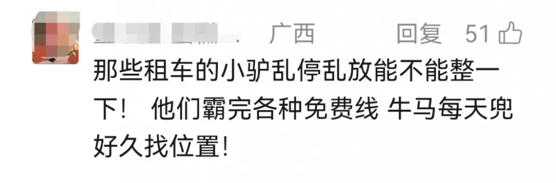 “那些租车的小驴乱停乱放能不能整一下! 他们霸完各种免费线,牛马每天兜好久找位置!”