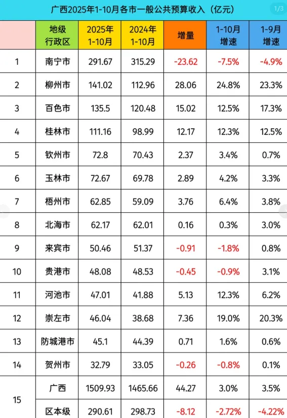 2025年1—10月,柳州市一般公共预算收入 141.02亿元,同比增长 **24.8%**。