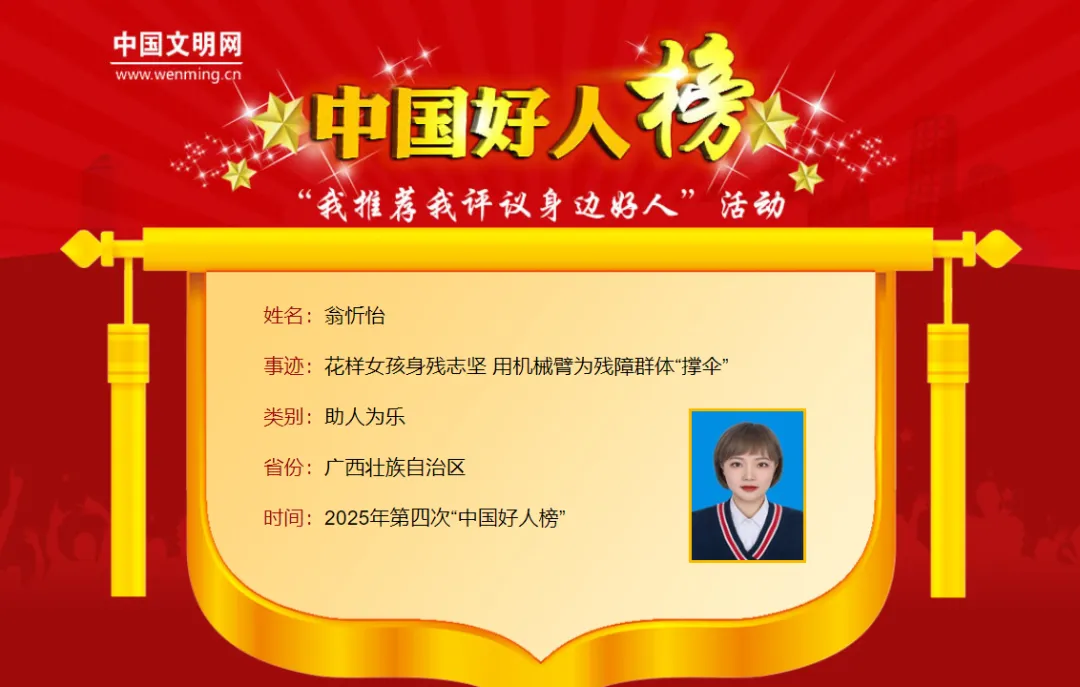 花样女孩身残志坚,用坚韧书写生命奇迹。翁忻怡,南宁市自媒体创业者、南宁市残疾人联合会公益宣传员。这位在25岁正值青春年华却因车祸失去左臂左腿的女孩,面对命运的打击,坚韧不拔,热心公益:帮白血病女孩筹款完成了关键的骨髓移植手术,为癌症患者送去心理慰藉,为和她一样的残障伙伴牵线搭桥解决就业……翁忻怡用自己的行动诠释了坚强乐观的精神,对社会产生了积极的影响。2025年8月2日,翁忻怡用坚韧书写生命奇迹的故事登上央视《新闻直播间》。