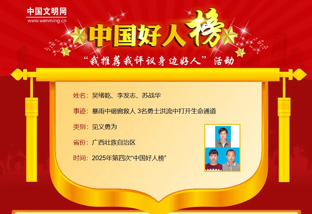 吴绪乾,男,1985年10月生,李发志,男,1989年6月生,苏战华,男,1974年6月生,三人均为广西壮族自治区梧州市藤县某机动车辆综合性能检测有限责任公司引导员。2025年8月4日,一场突如其来的暴雨席卷广西藤县,一辆白色轿车被激流困住,洪水漫至车窗,车内3人命悬一线。危急时刻,吴绪乾、李发志、苏战华以及几位热心群众挺身而出,救出车内3名被困人员。