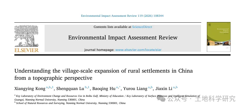 原文请见:Kong, X., Lu, S., Hu, B., Liang, Y., & Li, J. (2026). Understanding the village-scale expansion of rural settlements in China from a topographic perspective. Environmental Impact Assessment Review, 119, 108344.