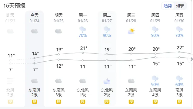 24日至25日,全市阴间多云,局部有小雨,有雾和回南潮湿天气。26日,全市阴到多云,大部有小雨,有雾和回南潮湿天气。27日,全市小雨转多云,大雾及回南潮湿天气结束。28日,全市多云到晴。