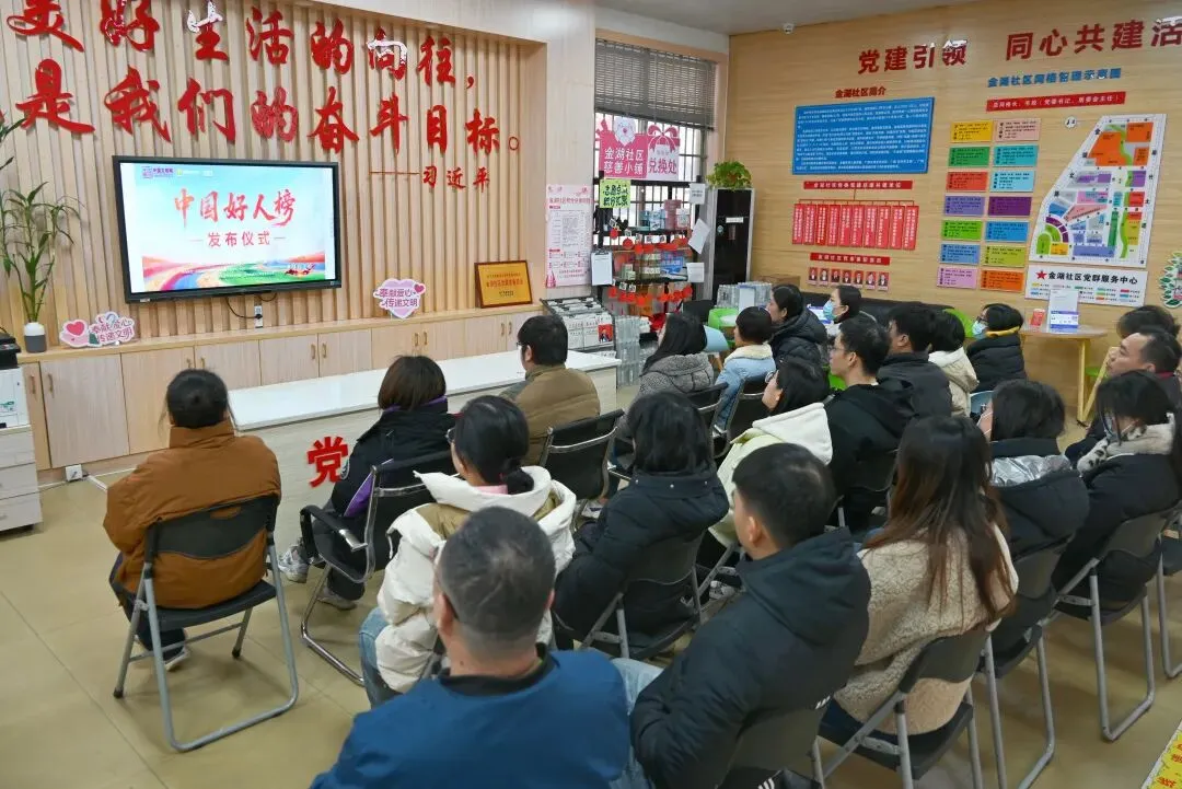 群众集中在金湖社区新时代文明实践站观看“中国好人榜”发布仪式。