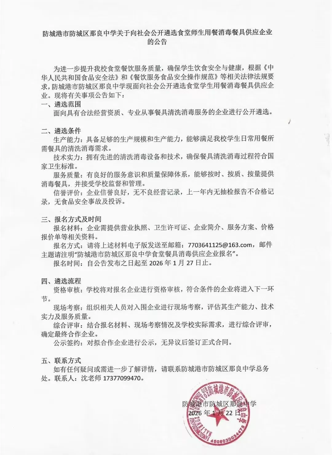 为进一步提升我校食堂餐饮服务质量,确保学生饮食安全与健康,根据《中华人民共和国食品安全法》和《餐饮服务食品安全操作规范》等相关法律法规要求,防城港市防城区那良中学现面向社会公开遴选食堂学生用餐消毒餐具供应企业。现将有关事项公告如下: