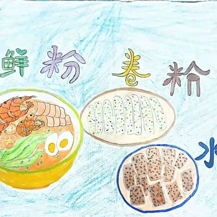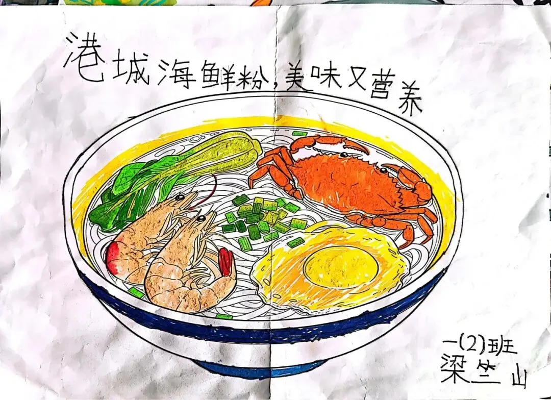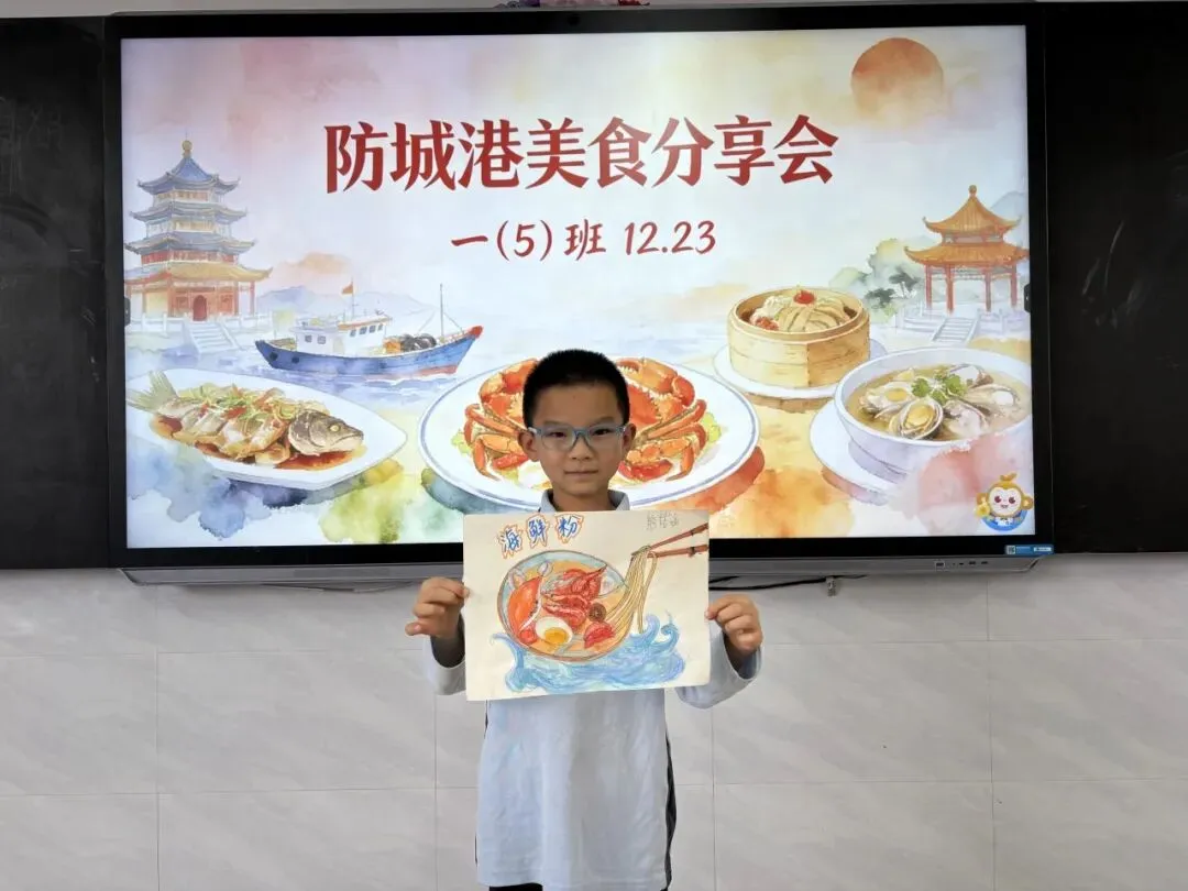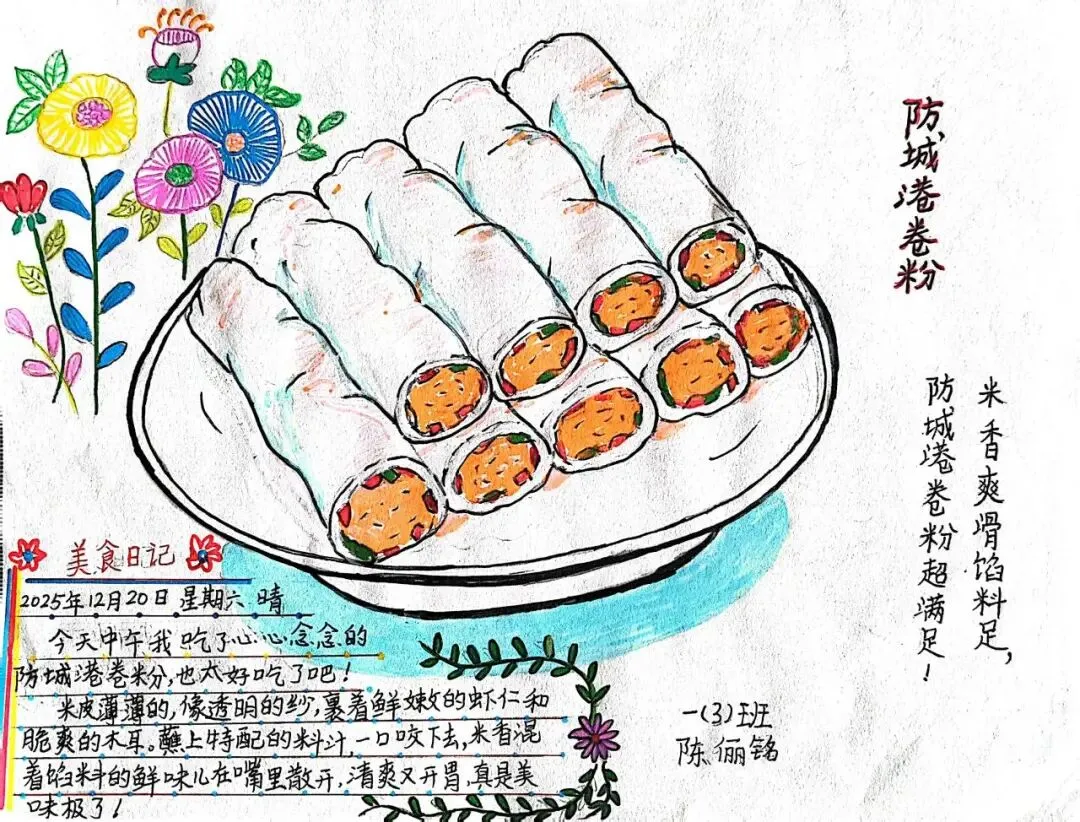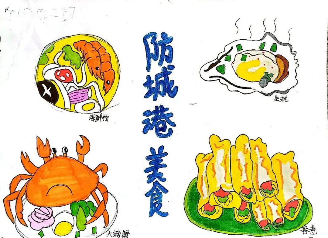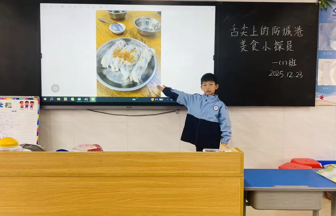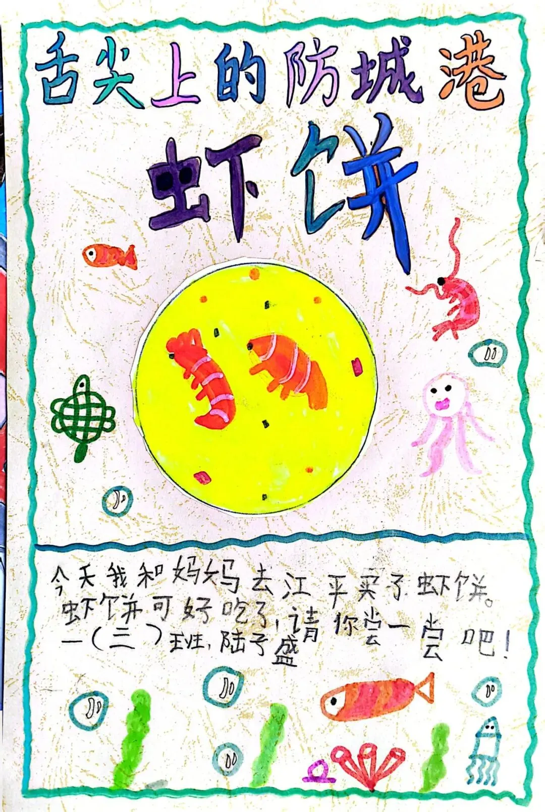 一年级的同学们化身“美食小探员”,在家长的陪伴下走进街头巷尾,寻找风吹饼、水籺、海鲜粉等防城港特色小吃。