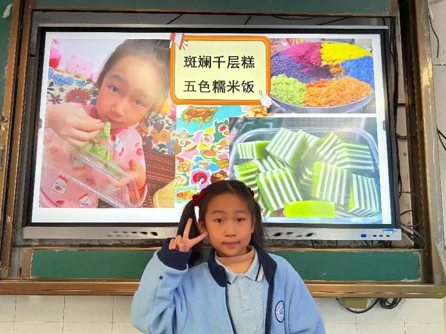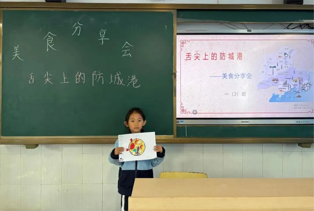 班级美食分享会现场热闹非凡,同学们举起自己的“美味日记”,奶声奶气地向同学介绍发现的美食,分享美食的味道和背后的小故事。有的说海鲜粉的汤鲜掉眉毛,有的讲风吹饼的制作小传说,稚嫩的话语里满是对家乡的认同。