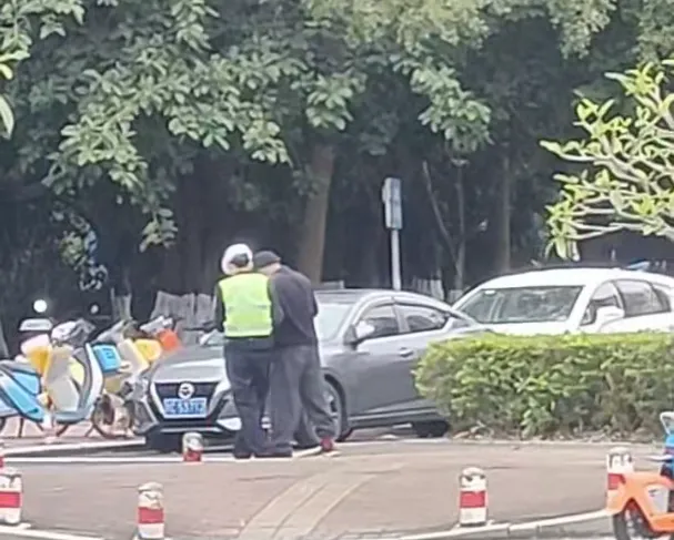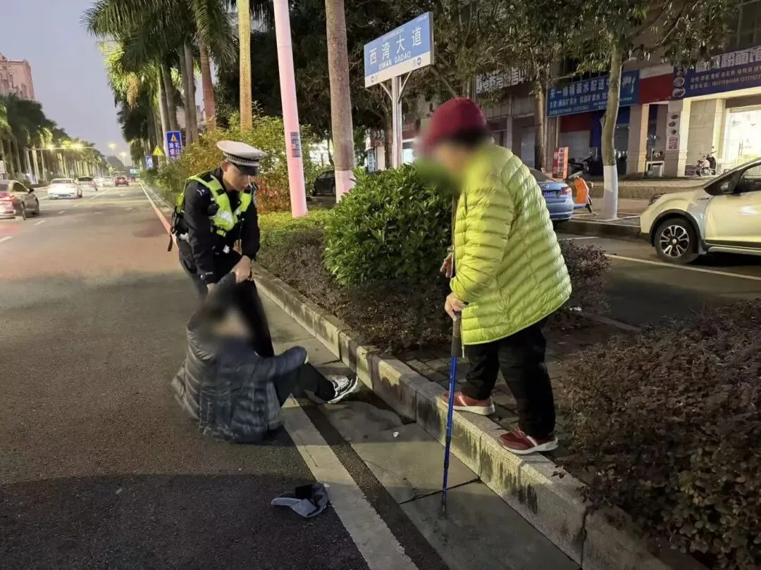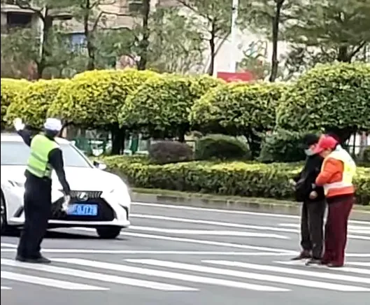 2026年1月6日早高峰,北部湾大道一处斑马线前,一位行动不便的老人过街步履维艰。交通劝导志愿者率先上前搀扶,防城港市公安局交管支队港口一大队执勤辅警邱邵群见状立即接力,共同护送老人缓慢而安全地通过路口。老人对二人的及时帮助连声道谢。