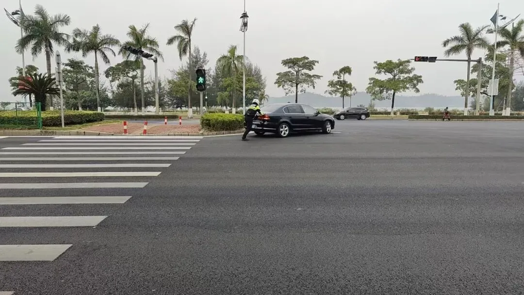 2026年1月4日早高峰,一辆轿车港口区在北部湾大道突发故障,停在路中影响通行,车来车往也十分危险。防城港市公安局交管支队港口一大队骑警郭力豪巡逻发现后,立即上前处置。确认车辆无法启动,他果断让司机控制方向,自己俯身将车推至安全区域进行故障排除。司机对他的及时帮助连声道谢。