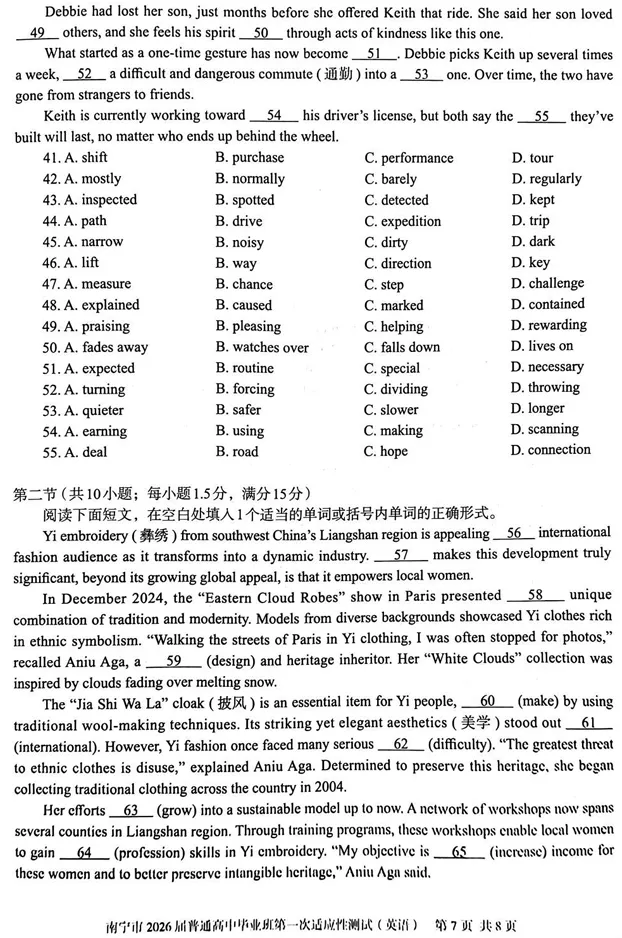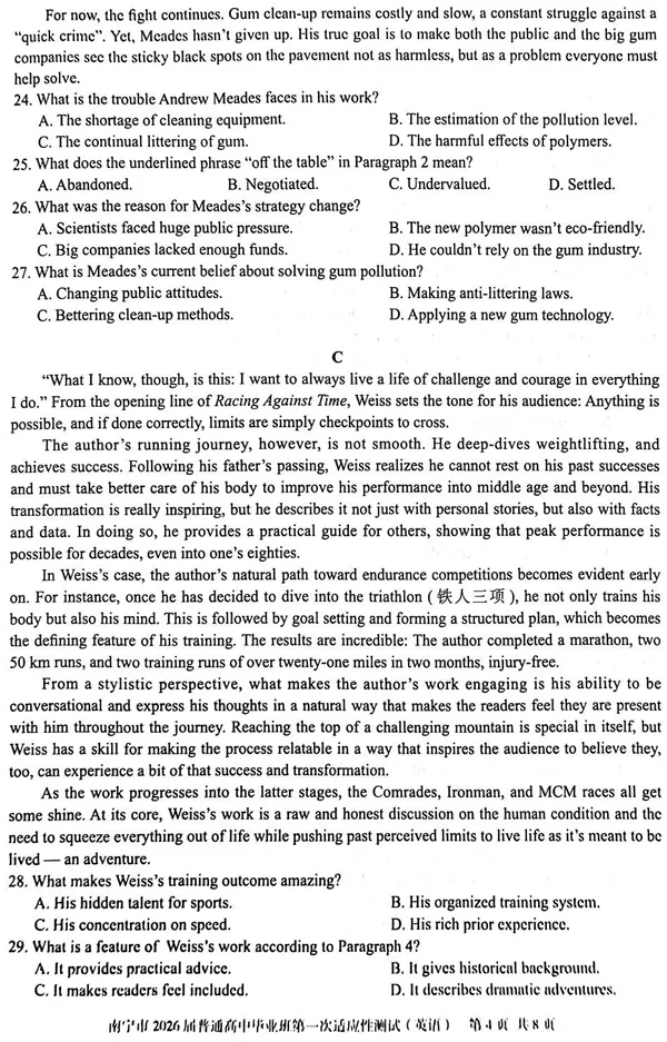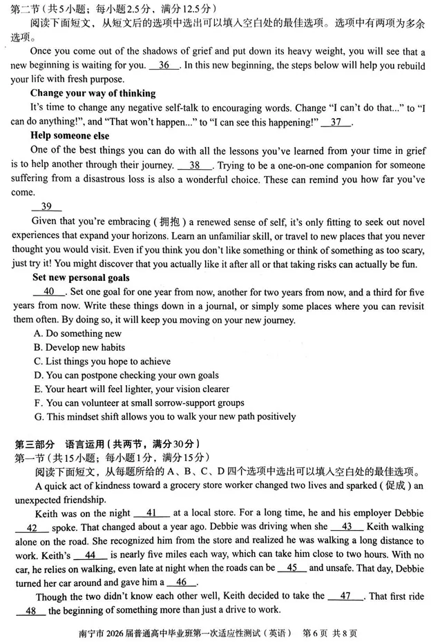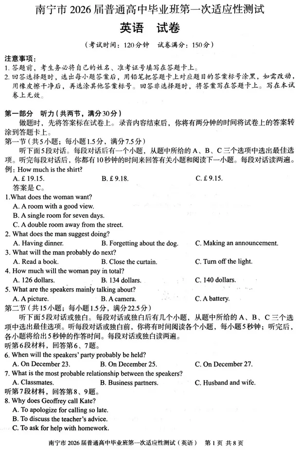 南宁市2026届普通高中毕业班第一次适应性测试英语试卷