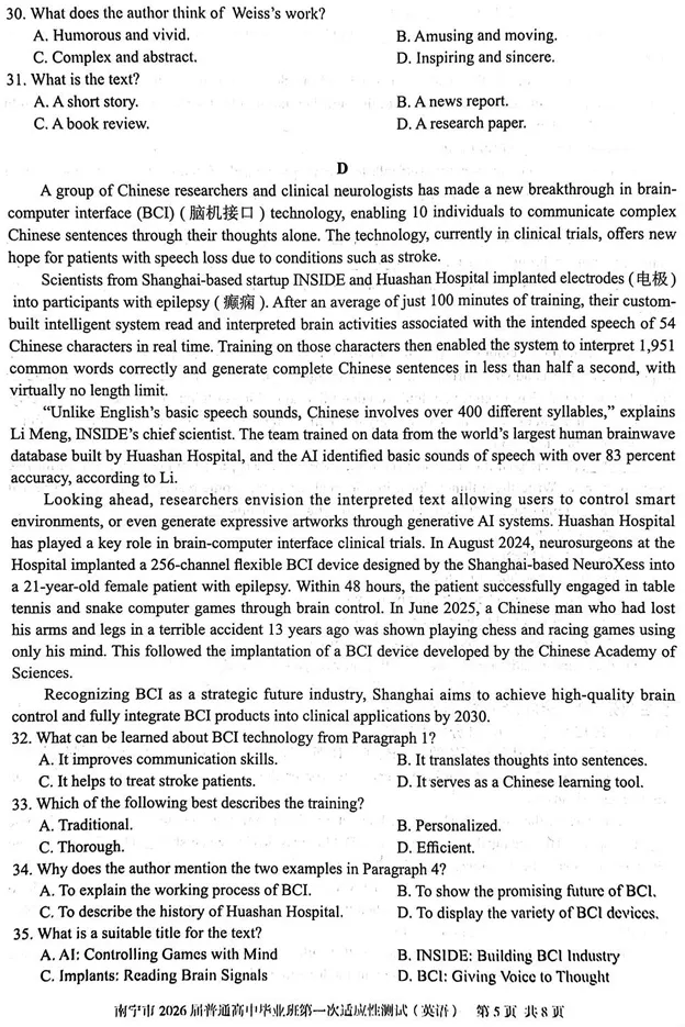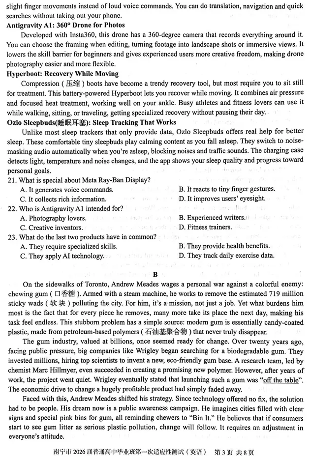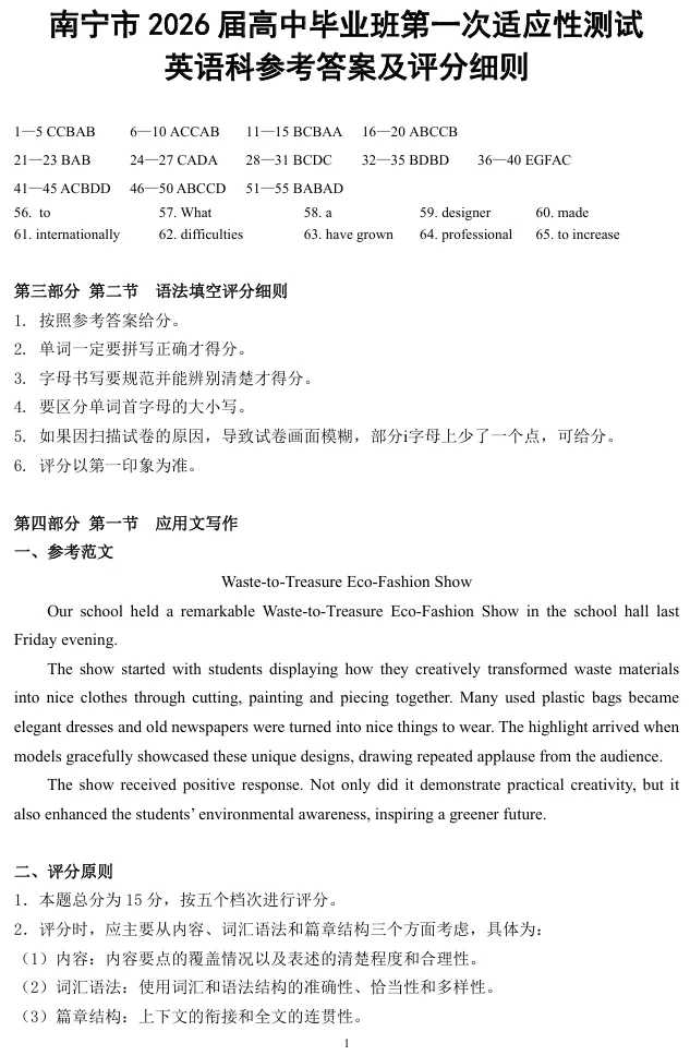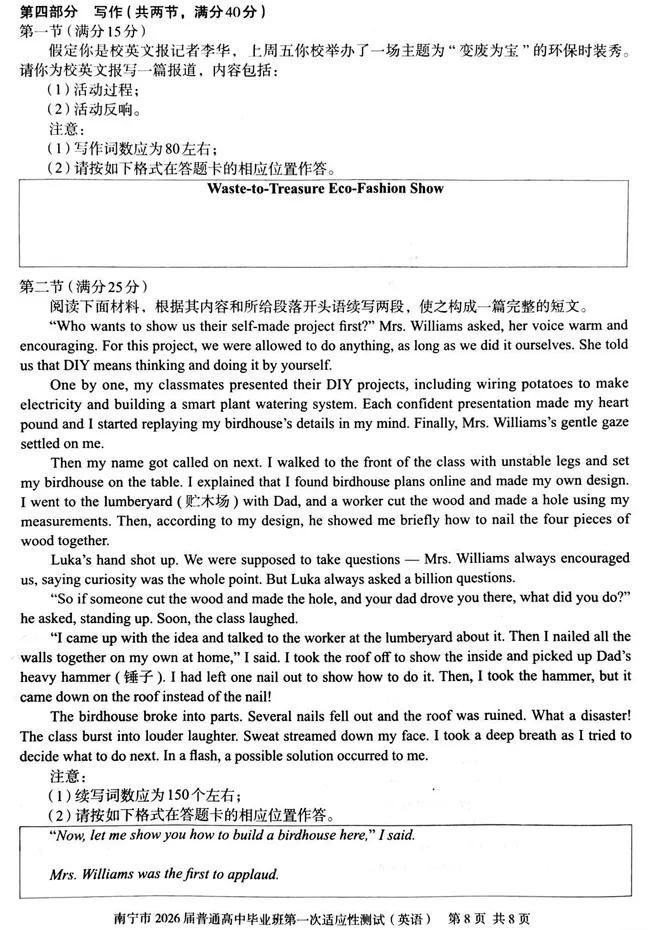 >南宁市2026届普通高中毕业班第一次适应性测试英语试卷