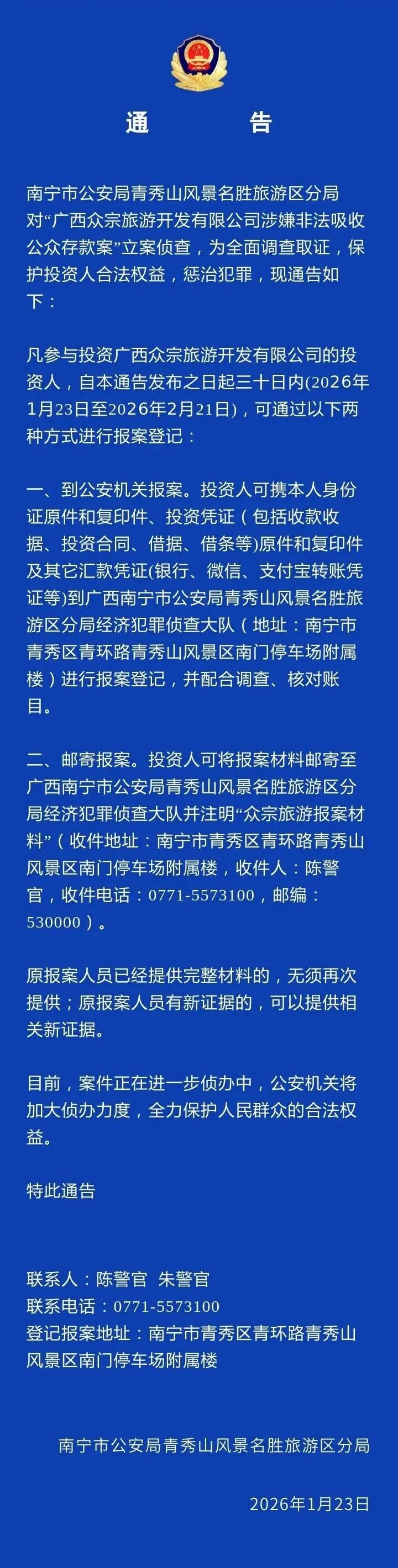 1月23日,南宁青秀山警方发布关于接收广西众宗旅游开发有限公司涉嫌非法吸收公众存款案案件材料的通告: