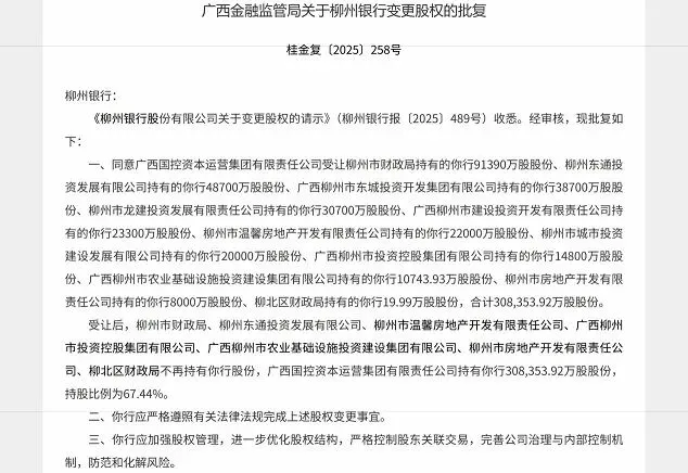 1月16日,广西金融监管局发布批复称,同意广西国控资本运营集团有限责任公司(下称“广西国控”)受让柳州银行11家股东所持该行共约30.84亿股股份,占总股本的67.44%。受让后,柳州市财政局等7家股东全部退出,不再持有该行股份。