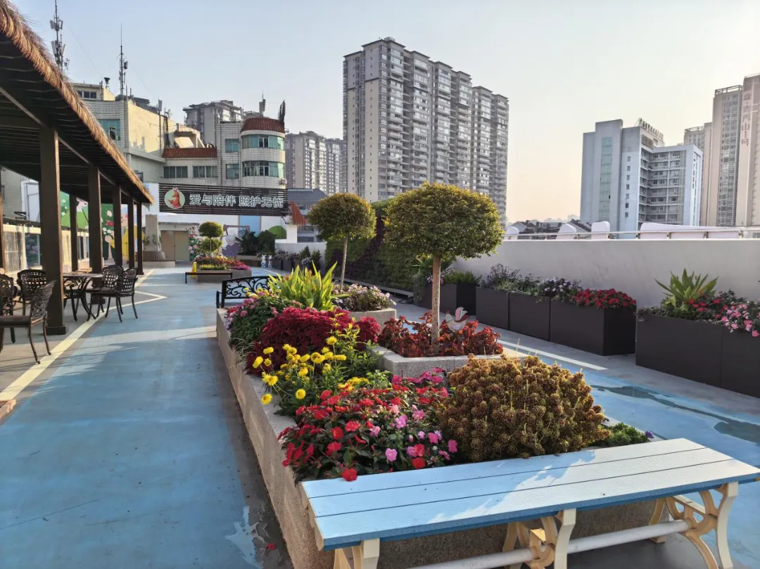 “我们想给长者提供的不仅是身体上的照顾,还有心灵上的疗愈。”爱护宁康养中心相关负责人说,花园在设计之初就融入了“芳香疗法”“参与式园艺”等理念,长者可以认领植物、参与养护,在劳动与观察中获得成就感和归属感。对于一些失能长者而言,熟悉花草的芬芳不仅能唤醒尘封的记忆,带来情感共鸣,更能在无形中舒缓情绪、抚慰心灵,发挥自然疗愈的独特作用。与此同时,花园在设计上兼顾美观与实用,原本空旷的顶楼加装了遮阳凉棚,增设透明防雨的公共晾晒区,侧墙通过温馨彩绘焕然一新。每一处细节都体现着人性化考量,让空间不仅赏心悦目,更真正贴近长者的实际需求与生活节奏。