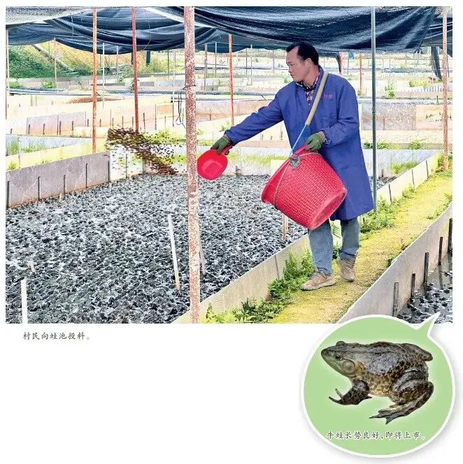 蛙池里,大个头的牛蛙正鼓着腮帮子叫得起劲。池边,村民正忙着投料、清理蛙池,动作娴熟。