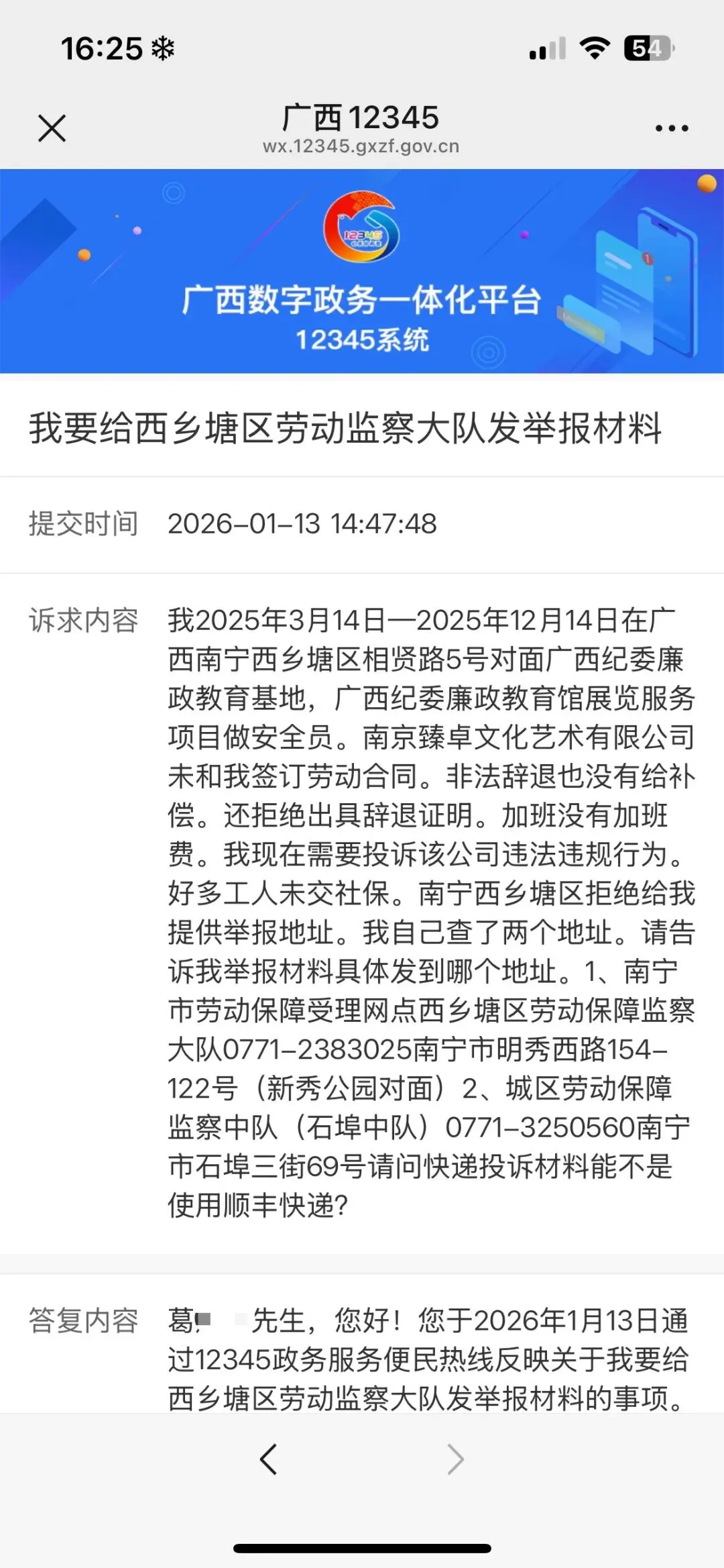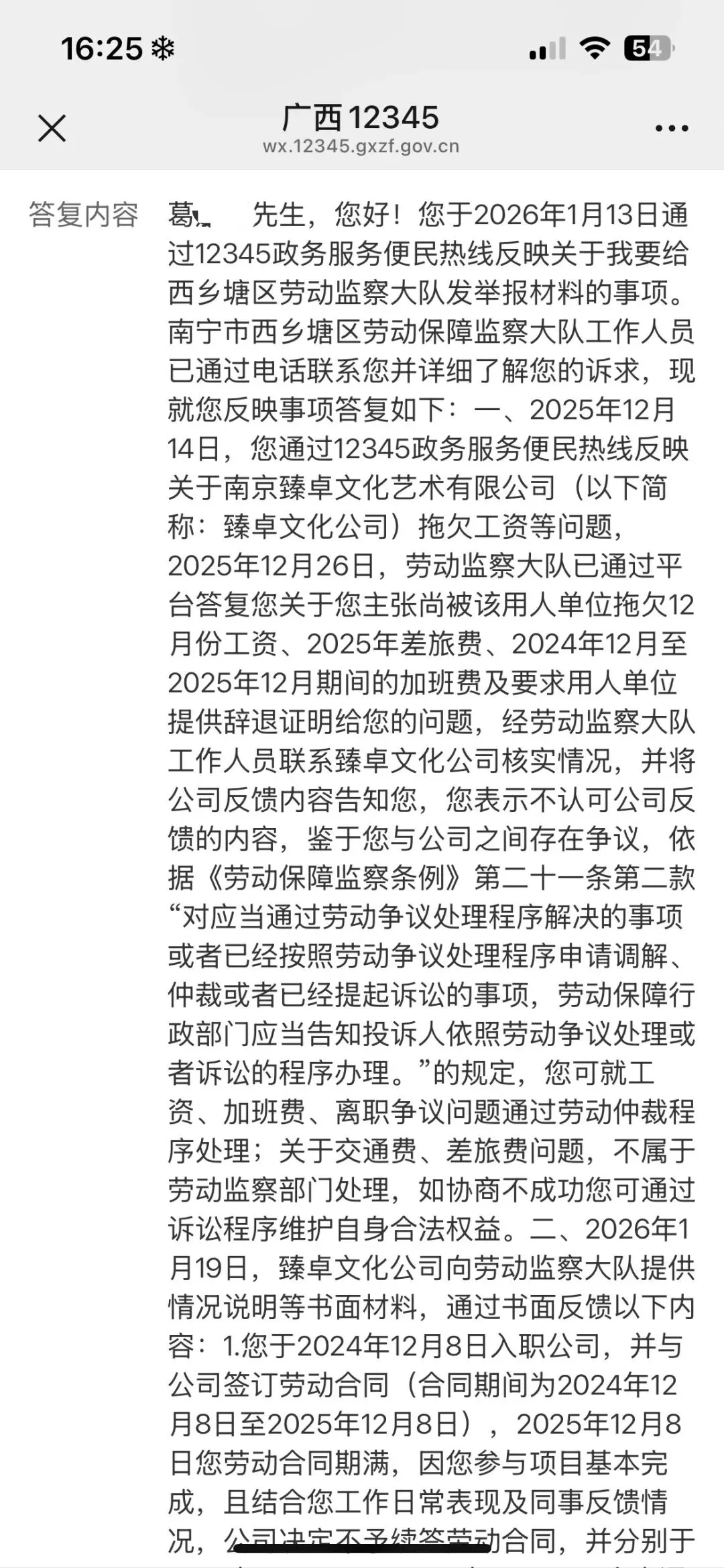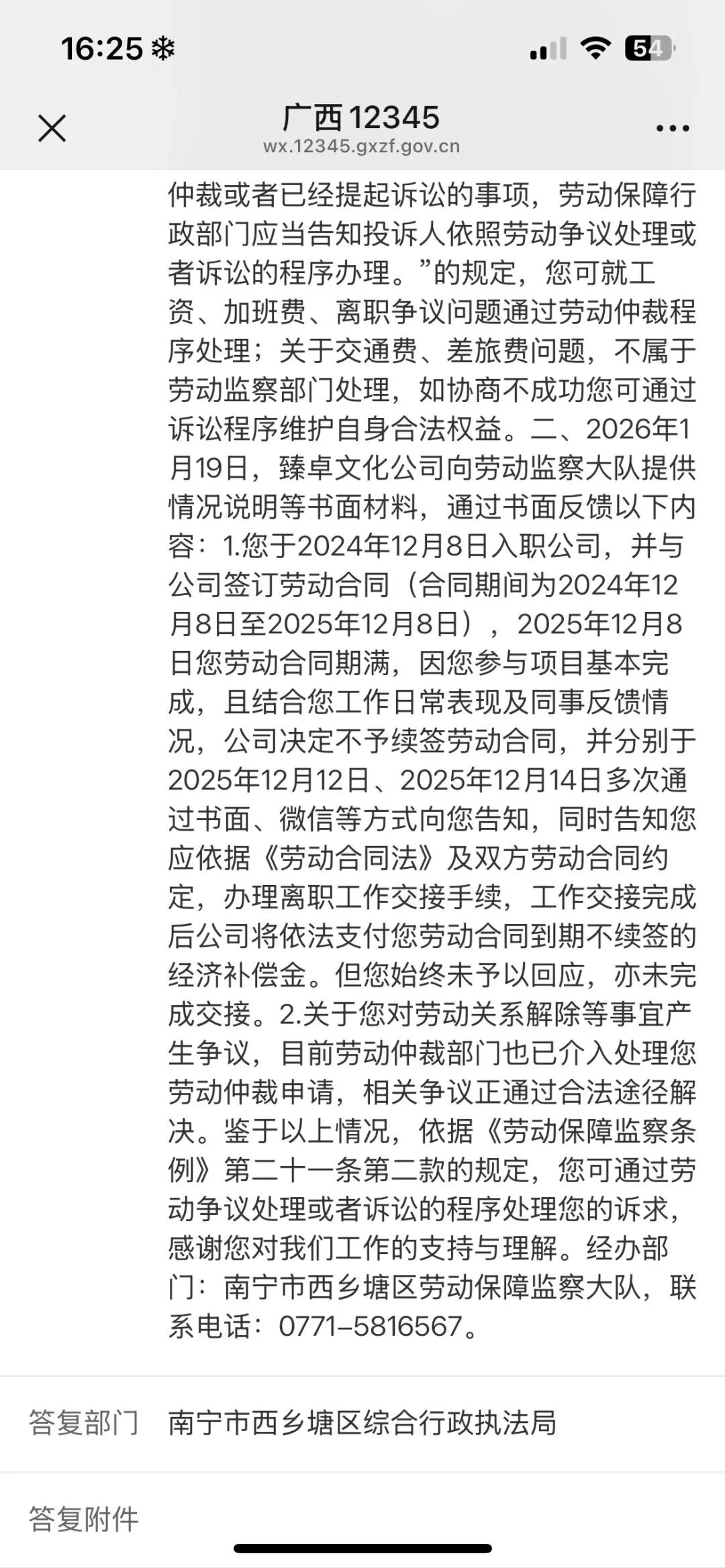 从广西南宁劳动监察的答复来看。南京臻卓文化艺术有限公司认为自己是合法解除劳动关系。公司认为我没有交接工作。