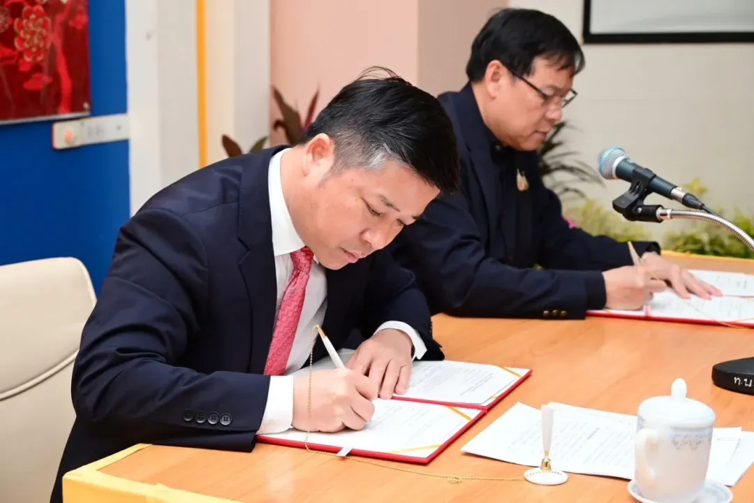 ▲泰国孔敬市市长巴实·通延泰与南宁轨道交通投资集团党委书记、董事长黄钟晖,在签约仪式上共同签署MaaS系统合作备忘录