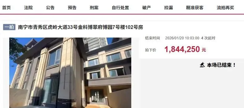 近日,在阿里拍卖上,南宁市迎来了一栋起拍价比较低的联排别墅拍卖。一栋位于南宁市青秀区虎岭大道33号金科博翠府博园7号楼102号房被拍卖。此次拍卖的这栋联排别墅,一共有4层,但是建筑面积不大,建筑面积只有218.13㎡(套内建筑面积:192.71㎡,分摊建筑面积:25.42㎡),,三房两厅户型。房子现在还是毛坯房,没有装修入住过,同时别墅物业费共欠9000元(具体欠费金额自行咨询相关单位,该费用由买受人自行处理)。