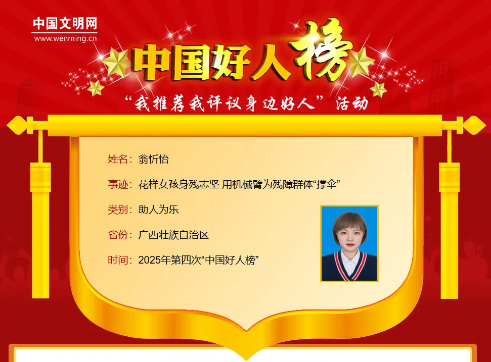 2020年,一场突如其来的车祸,让正值青春韶华的翁忻怡永远失去了左臂和左腿。命运的骤变未曾击垮这个坚强的女孩。她选择直面伤痛,将网名改为“翁右右”,勇敢地通过自媒体平台分享自己的康复历程与心路。一条条真挚的短视频,记录了她从绝望到重生的点滴,也如星星之火,为无数身处同样逆境的人,点燃了希望。一位因车祸双腿重伤、一度意志消沉的江苏青年,正是在观看她的视频后,被她“钢铁战士”般的精神所感染,重拾了生活的勇气与康复的信心。翁忻怡用自己的经历证明:身体的残缺无法禁锢灵魂的高度,真正的强大源于内心的不屈与昂扬。