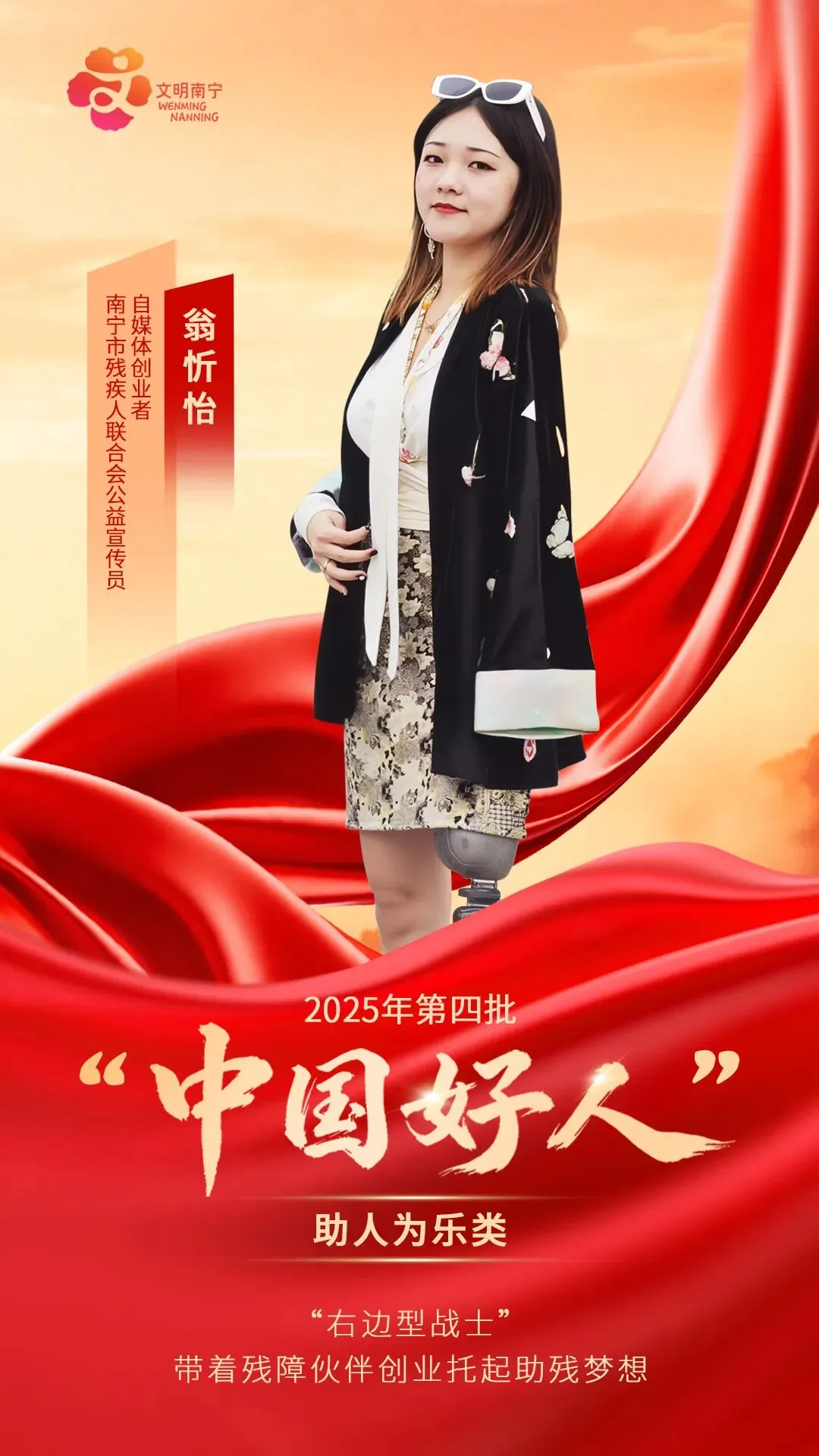 翁忻怡,自媒体创业者、南宁市残疾人联合会公益宣传员,在经历命运重创后,不仅自身顽强“站”立起来,带动残障伙伴共同创业,以实际行动诠释了人间大爱与生命价值。接下来,让我们一起走进她的故事,感受这份平凡中的伟大。