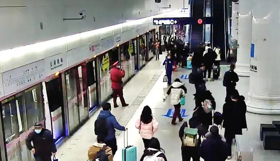 当天上午8时许,天河机场站工作人员黄博文上车巡查时,发现一无人认领的双肩包,随即拿下车并报告车控室。