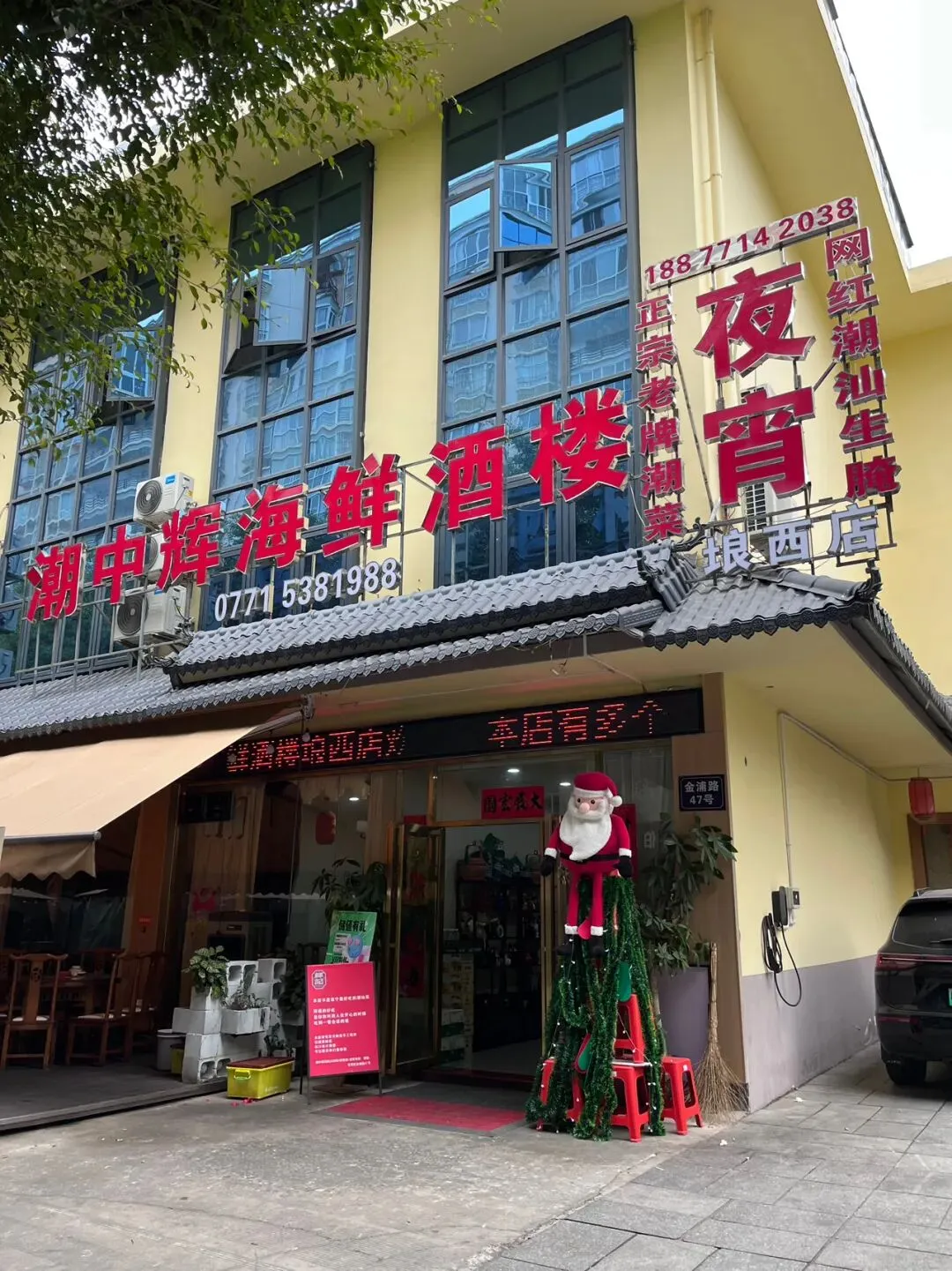 这里这么多树,夏天的时候应该非常凉爽,很适合吃海鲜。