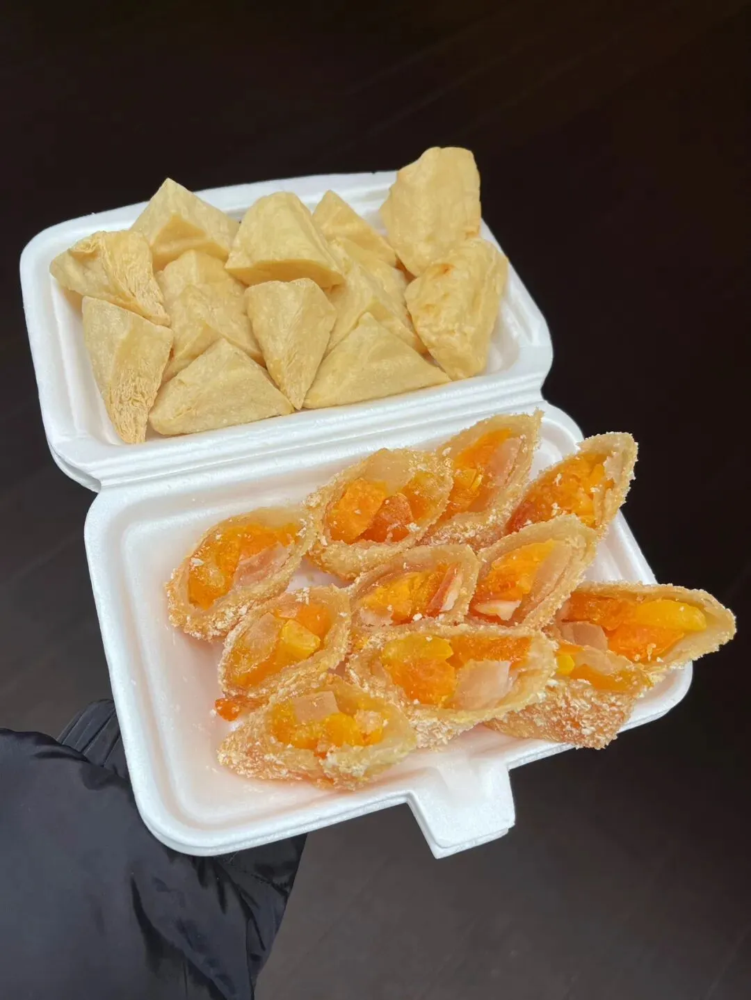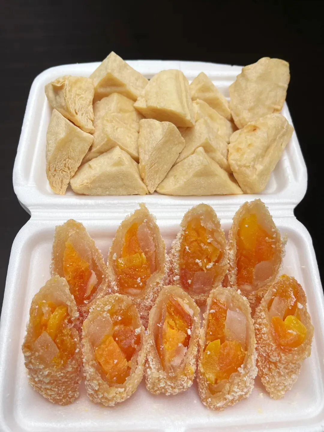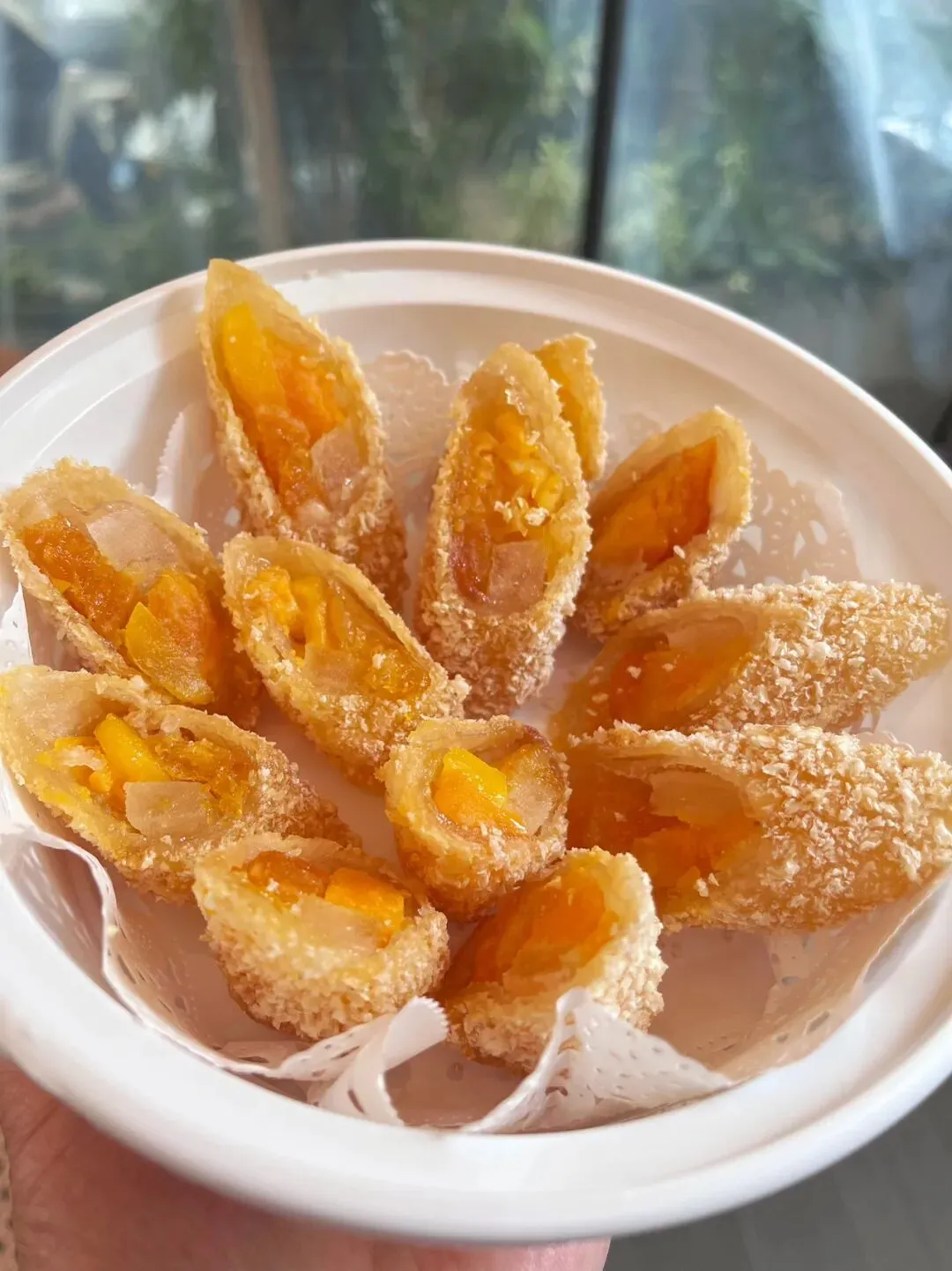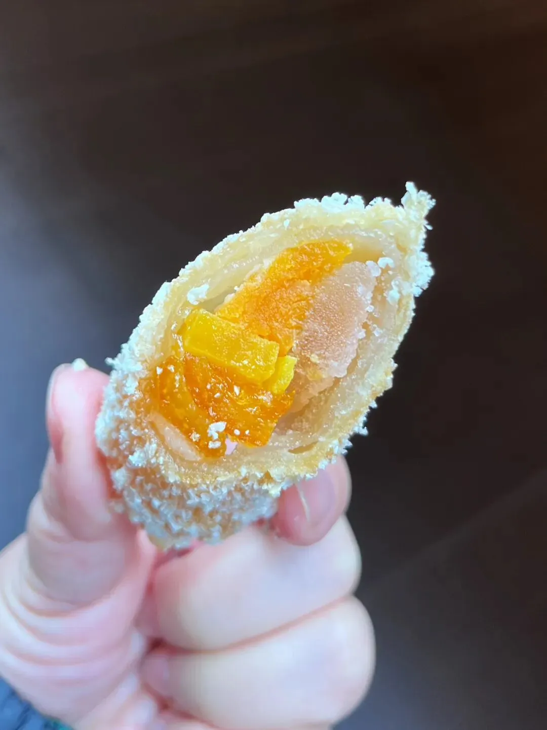 这里面放了咸蛋黄、冬瓜糖、还有不知道是金桔还是橙皮的东西,外面那层吃不出是什么,据说是一层薄薄的肥猪肉放糖腌制的肥肉冻,表层裹了生粉和面包糠,一起炸。