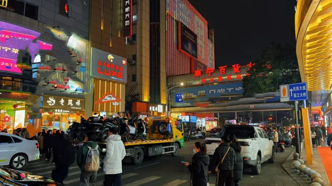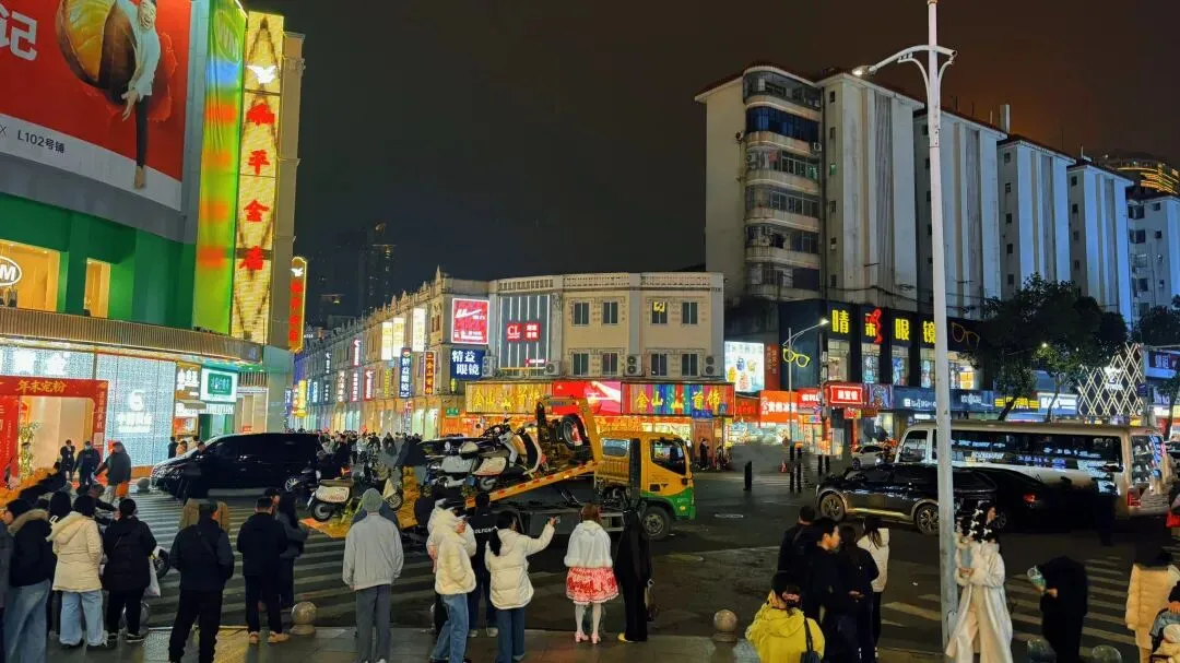 刚开始我以为是干什么的,好多人在围观一看旁边的摆摊人惊慌失措的,好多电动车都被拉走了,因为随意停放在路边占道摆摊,每到周末或者节假日这个地方乱成一锅粥,车子,人基本都是堵在一起……