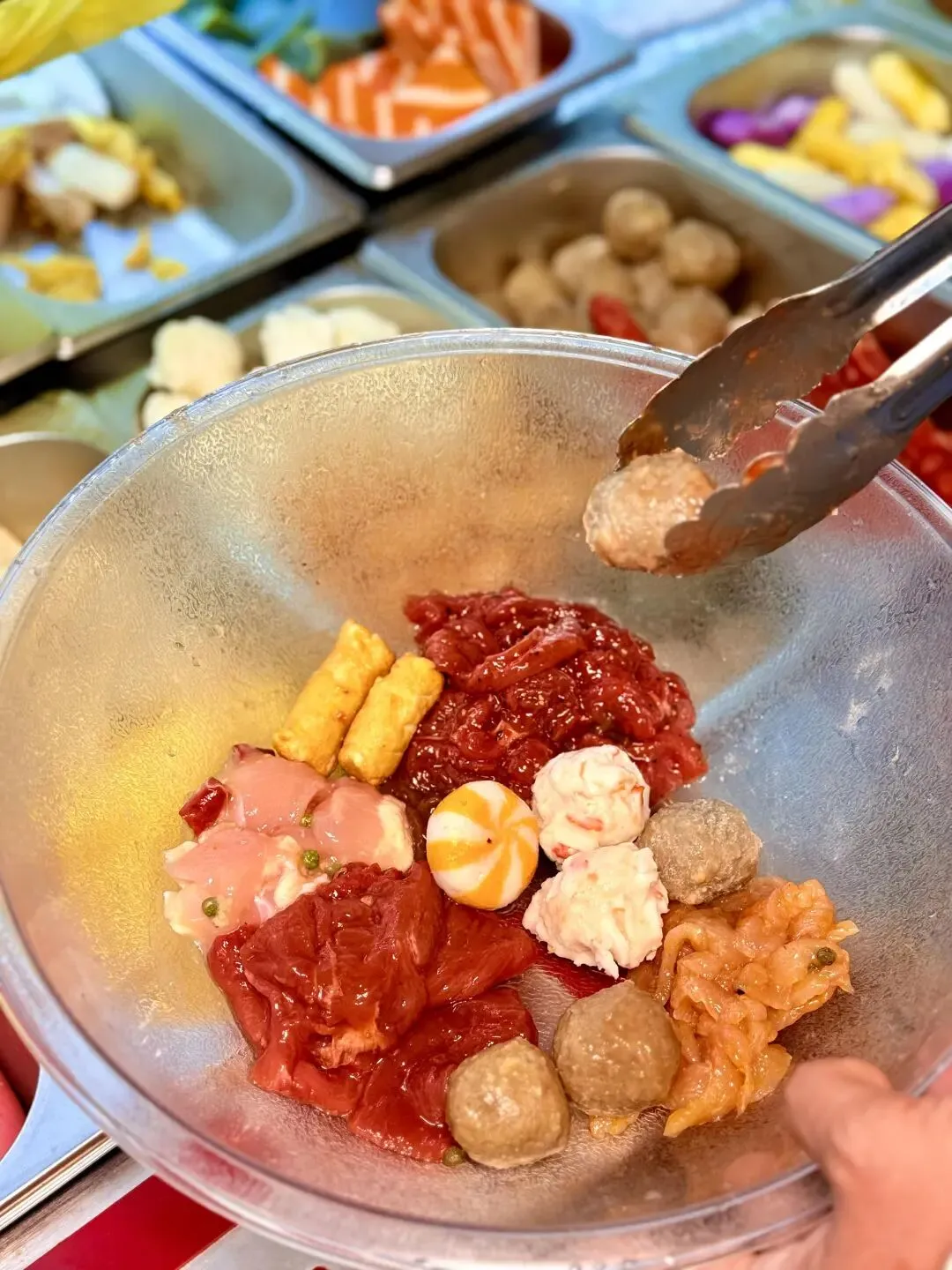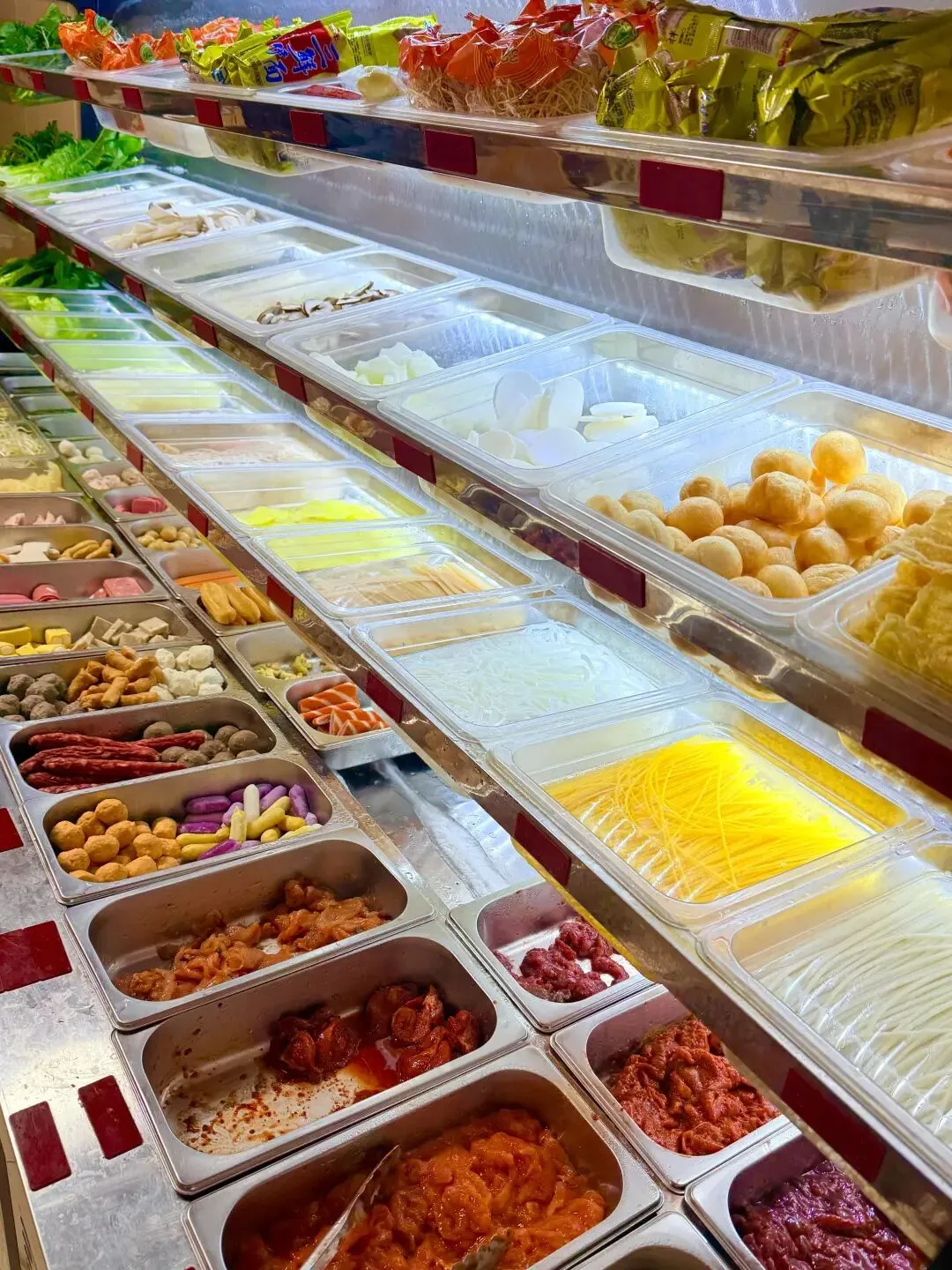 店里的装修简单又接地气,白墙贴着几张东北风情的海报,靠墙摆着几张木质方桌,桌角还留着些许烟火气的痕迹。王姐是地道的东北人,说话爽朗又热情,看到我进门就笑着招呼:“姑娘随便选!想吃啥拿啥,不想挑我帮你搭配,保准好吃!” 食材柜就摆在门口,琳琅满目得让人眼花缭乱:各种鲜面条、时蔬、丸子、豆制品、肉类整齐码放,新鲜得能看到水珠,连我爱吃的方便面饼、响铃卷都有,选择困难症都要犯了。